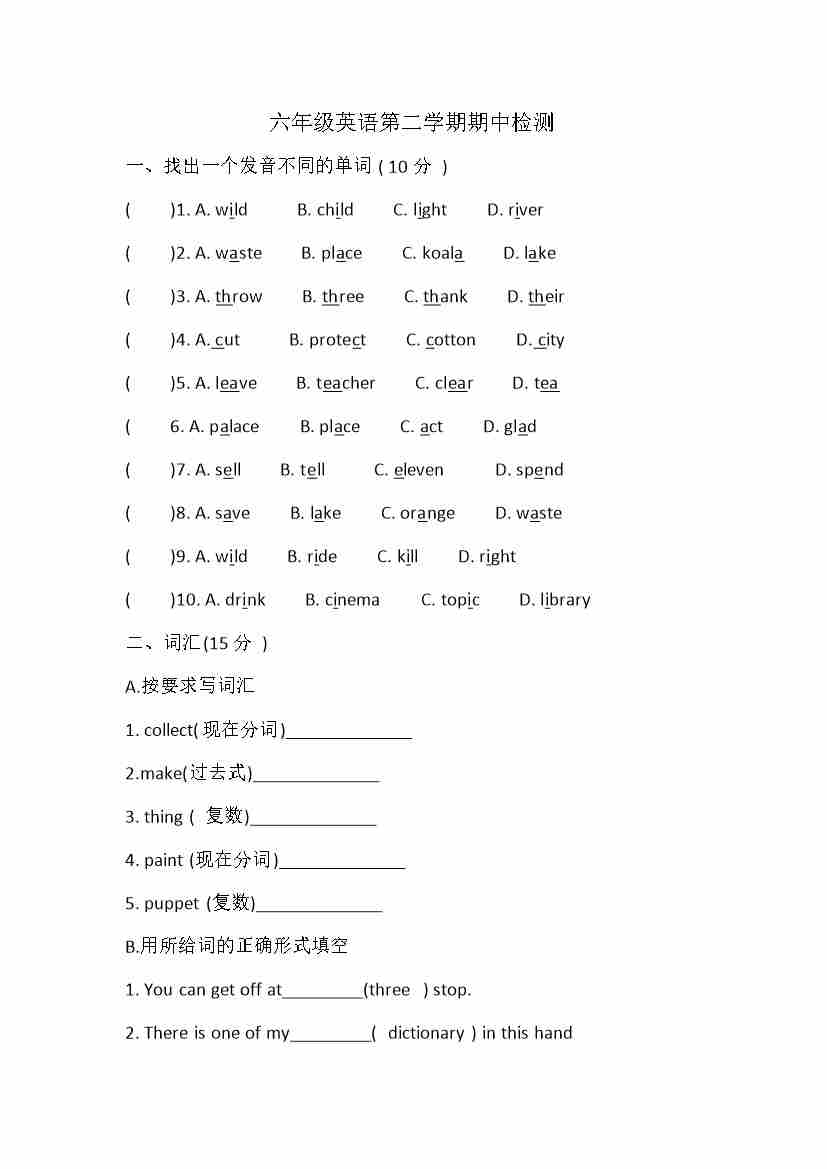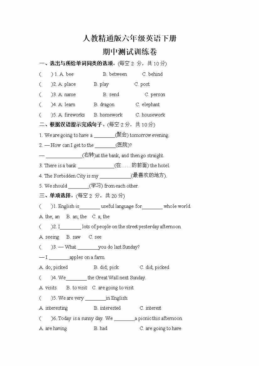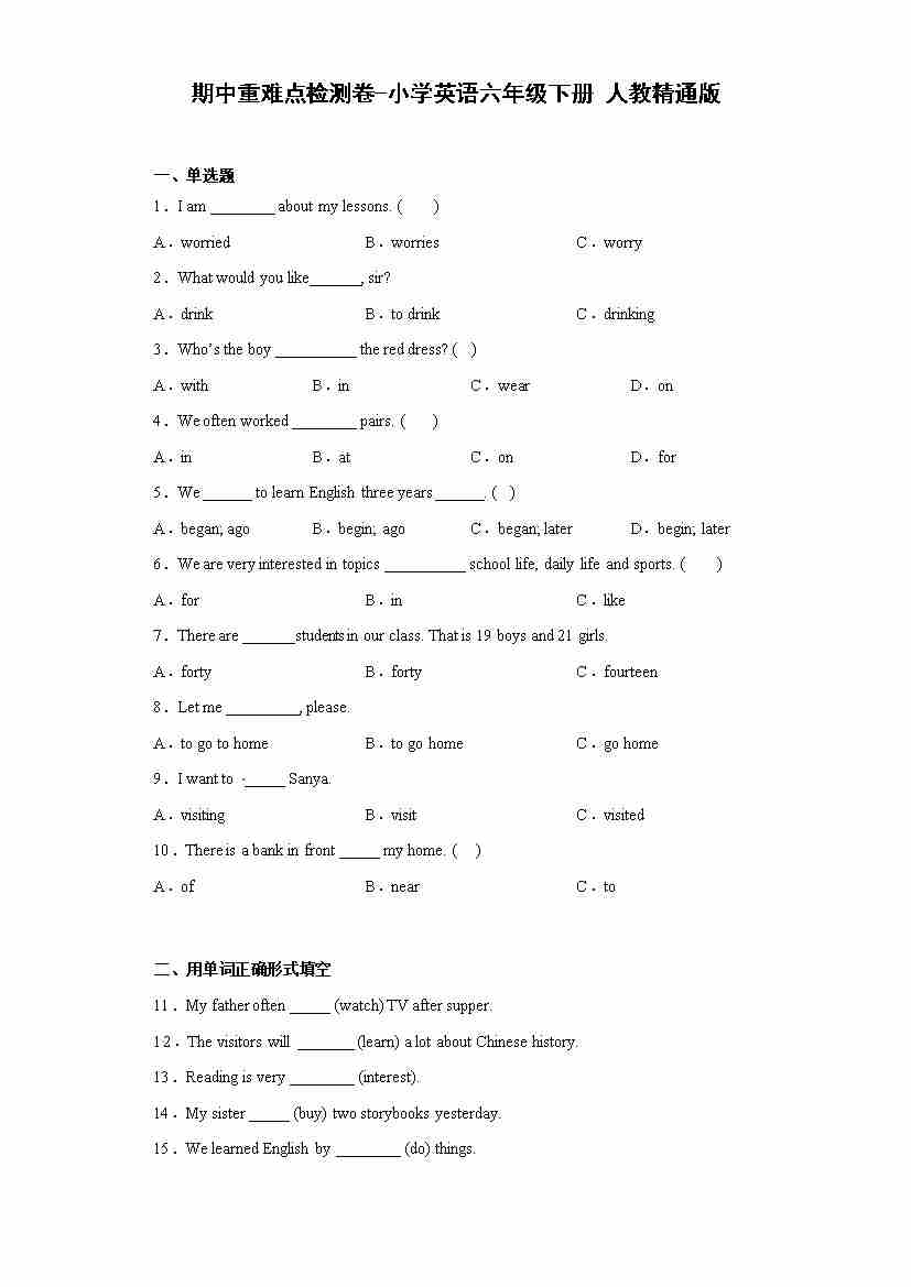 期中重难点检测卷-小学英语六年级下册 人教精通版
