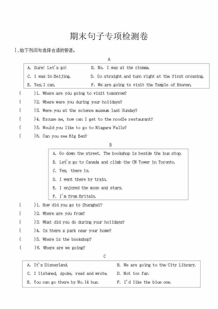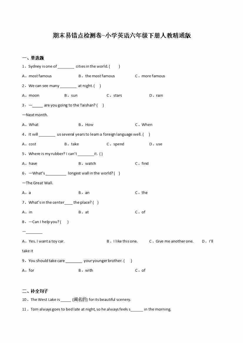 期末易错点检测卷-小学英语六年级下册人教精通版