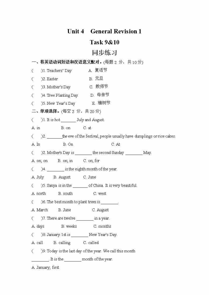 Unit 4 General Revision 1 Task 9&10 (同步练) 人教精通版英语六年级下册
