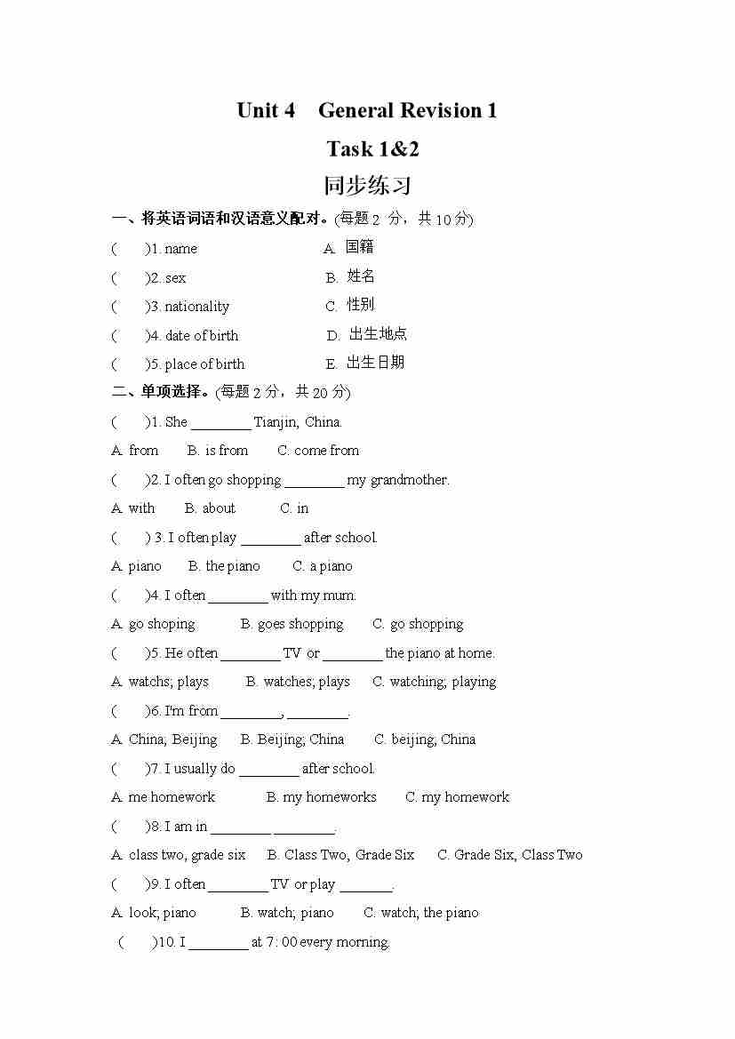 Unit 4 General Revision 1 Task 1&2 (同步练习) 人教精通版英语六年级下册