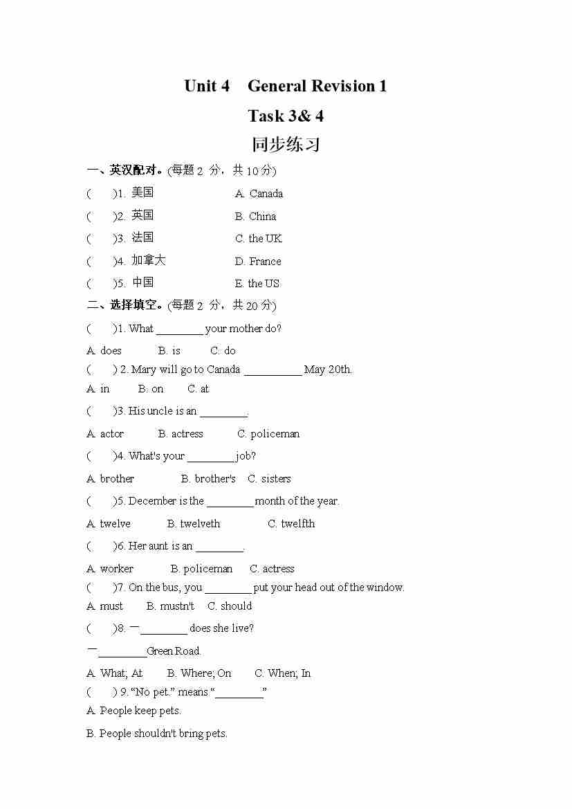 Unit 4 General Revision 1 Task 3& 4 (同步练习) 人教精通版英语六年级下册