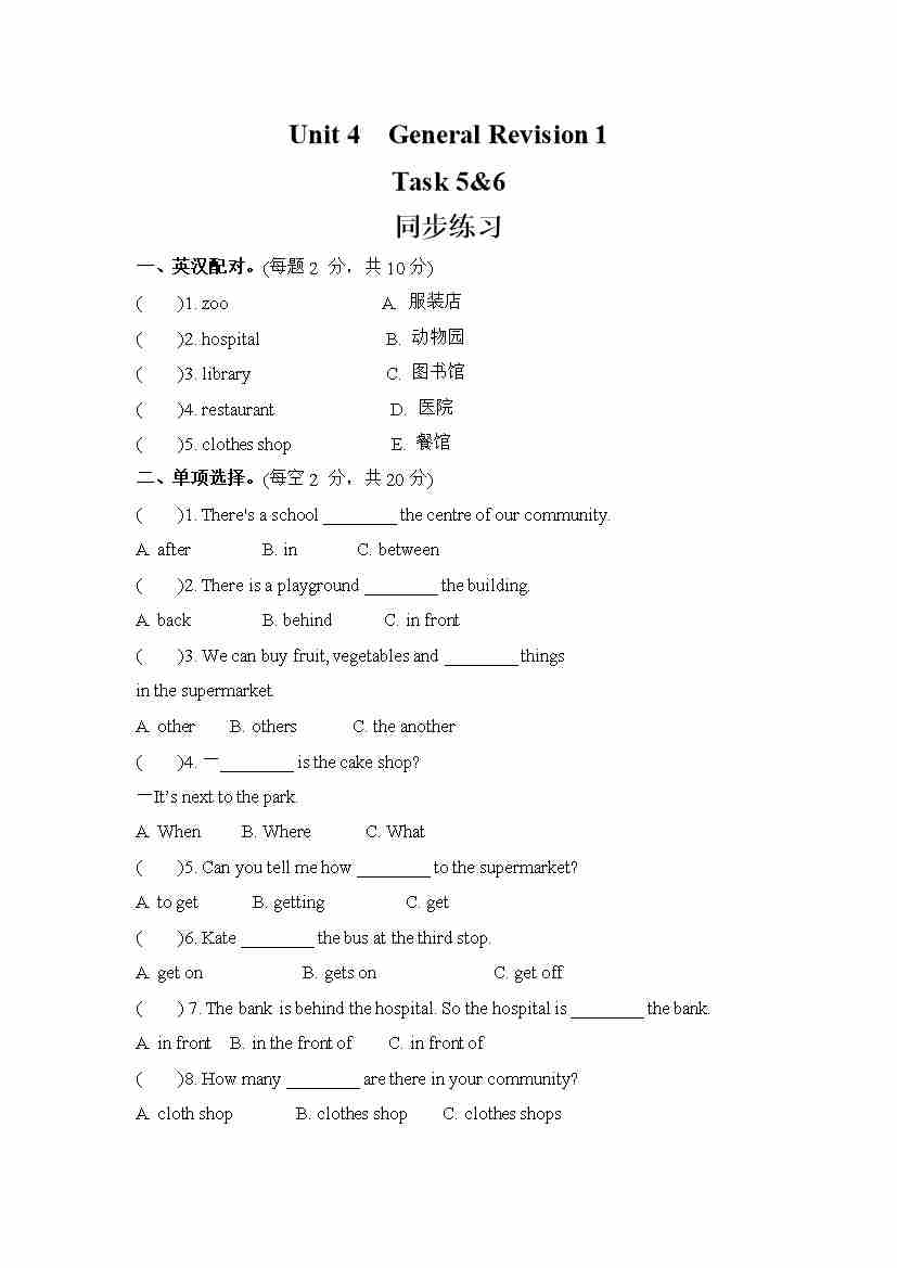 Unit 4 General Revision 1 Task 5&6 (同步练) 人教精通版英语六年级下册