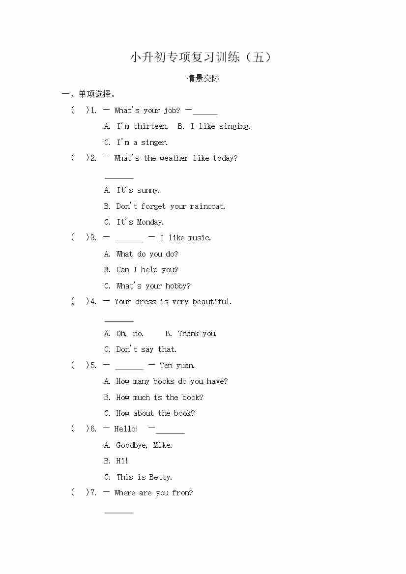 小升初 情景交际(专项训练)