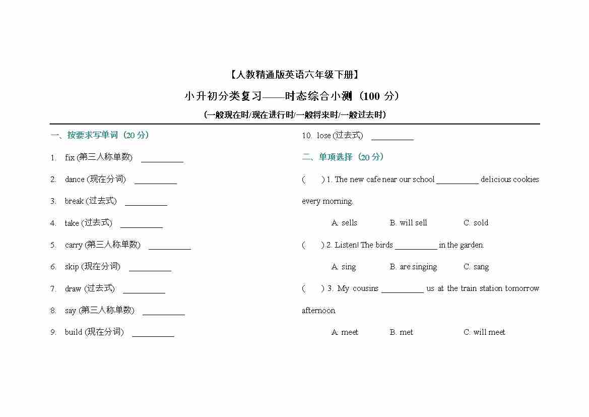 小升初分类复习 时态综合小测(专项训练)