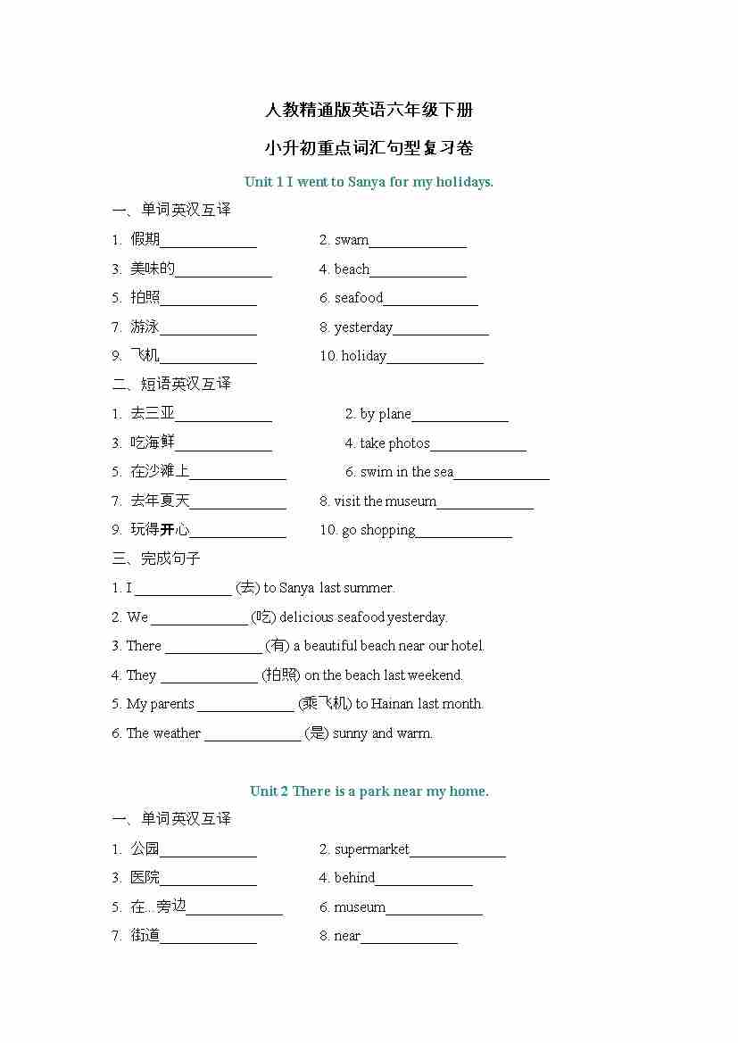 小升初重点词汇句型复习卷(专项训练)