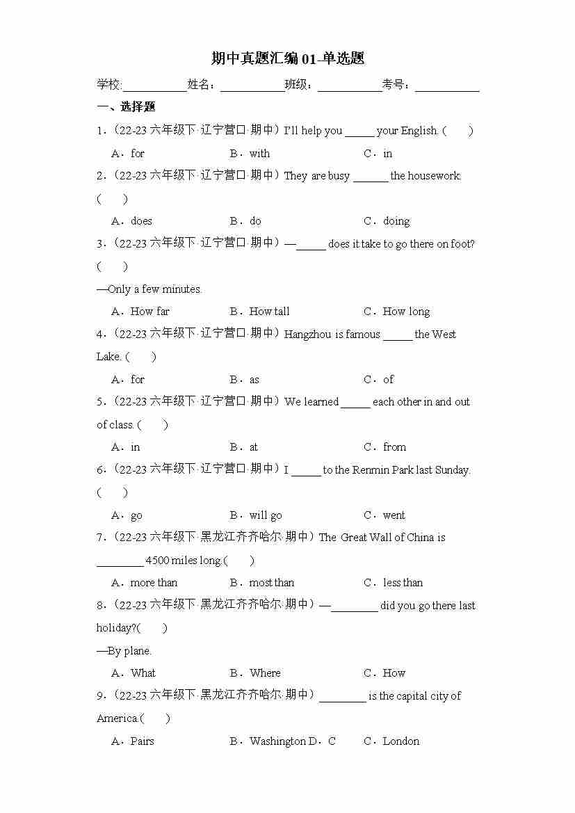 期中专题01 单选题