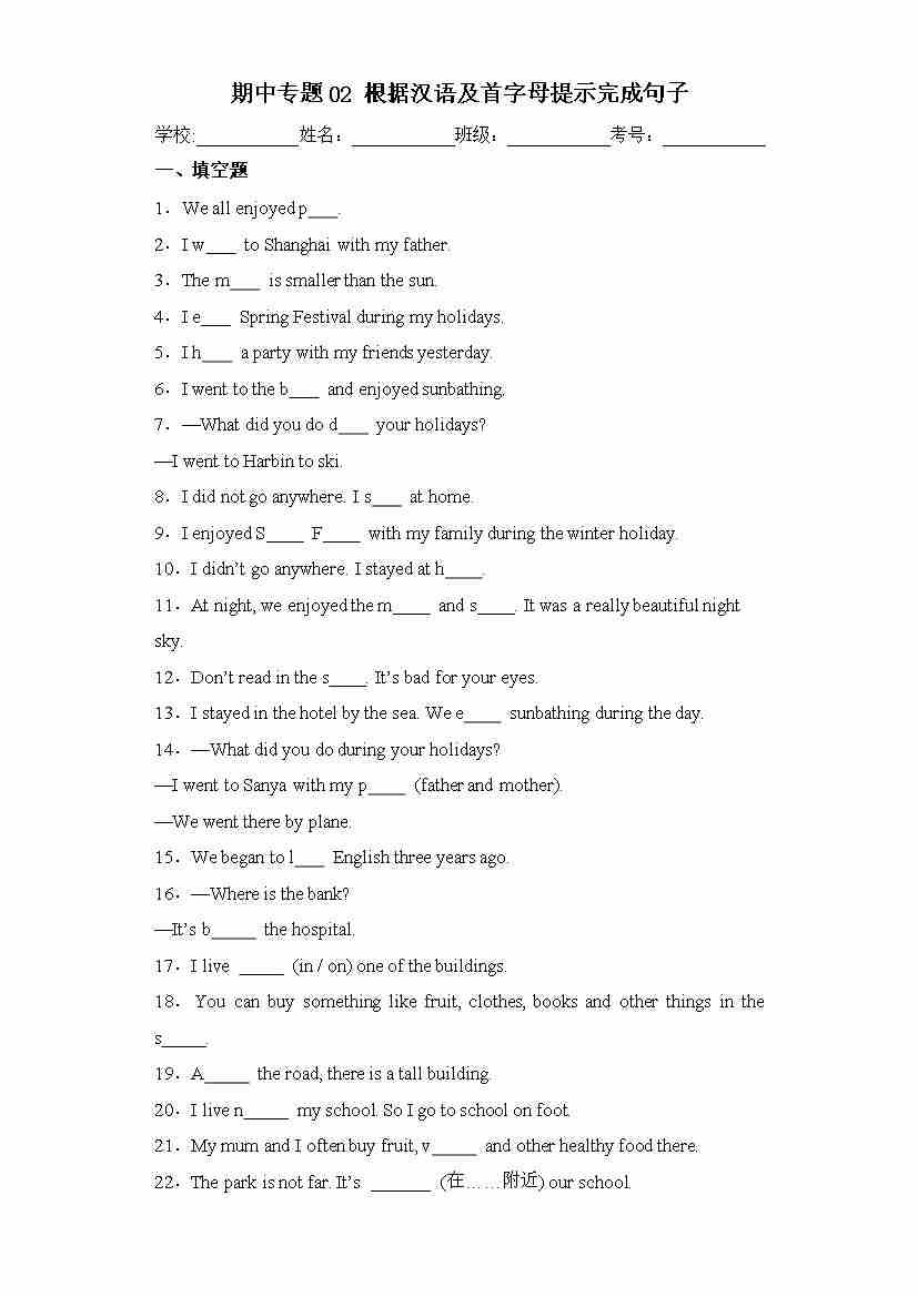 期中专题02 根据汉语及首字母提示完成句子