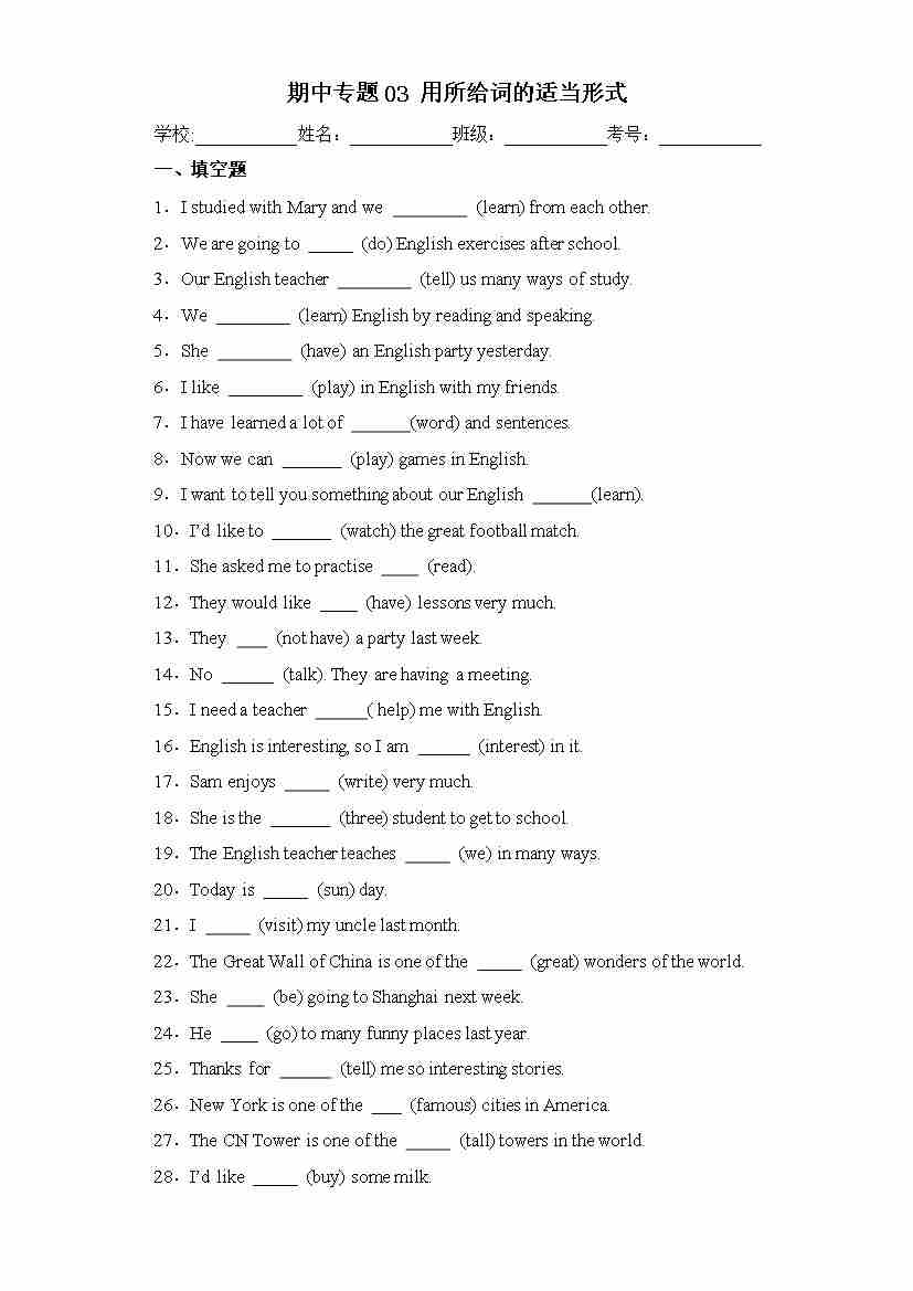 期中专题03 用所给词的适当形式