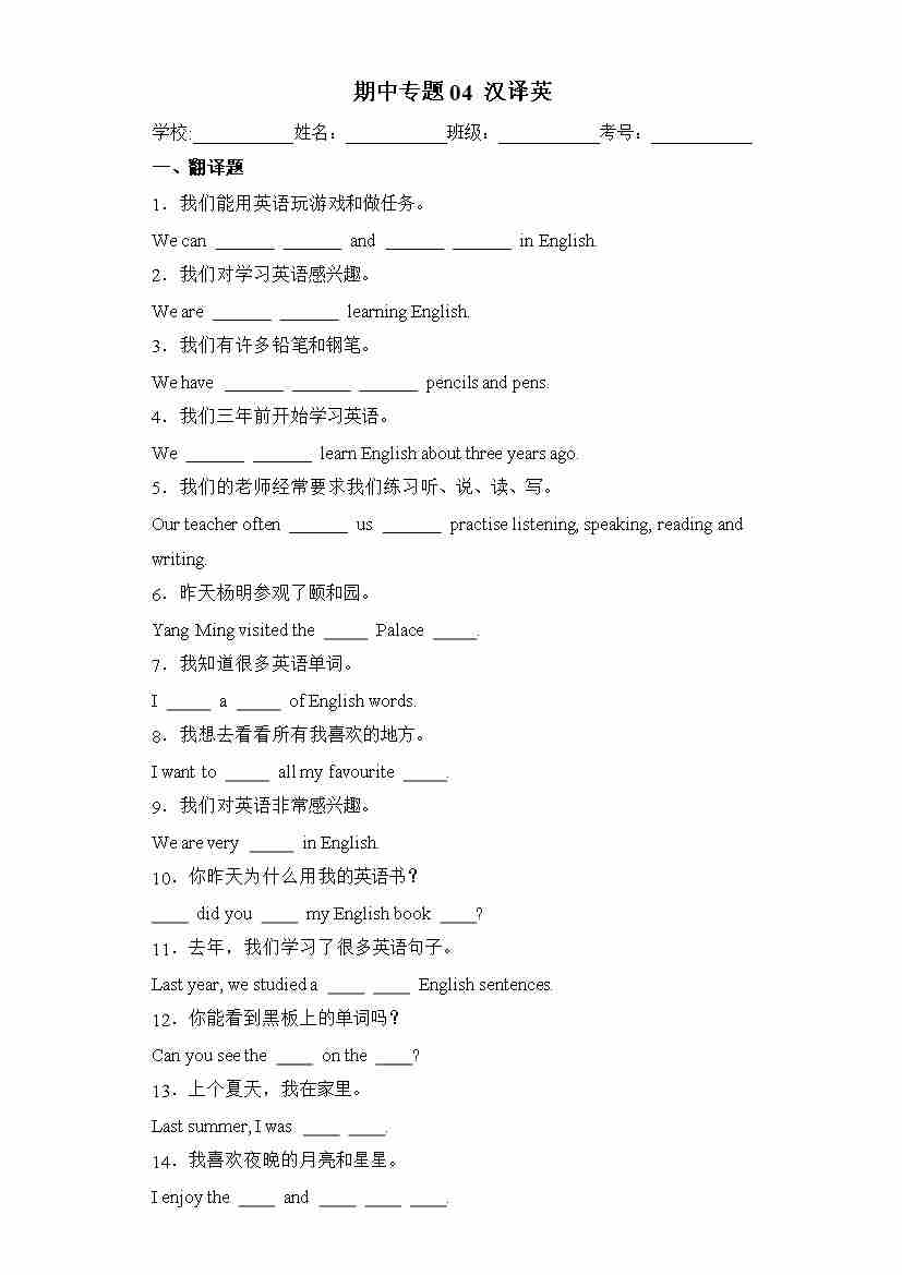 期中专题04 汉译英
