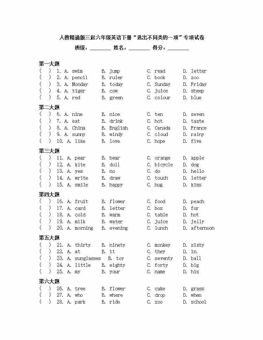 选出不同类的一项(专项训练)