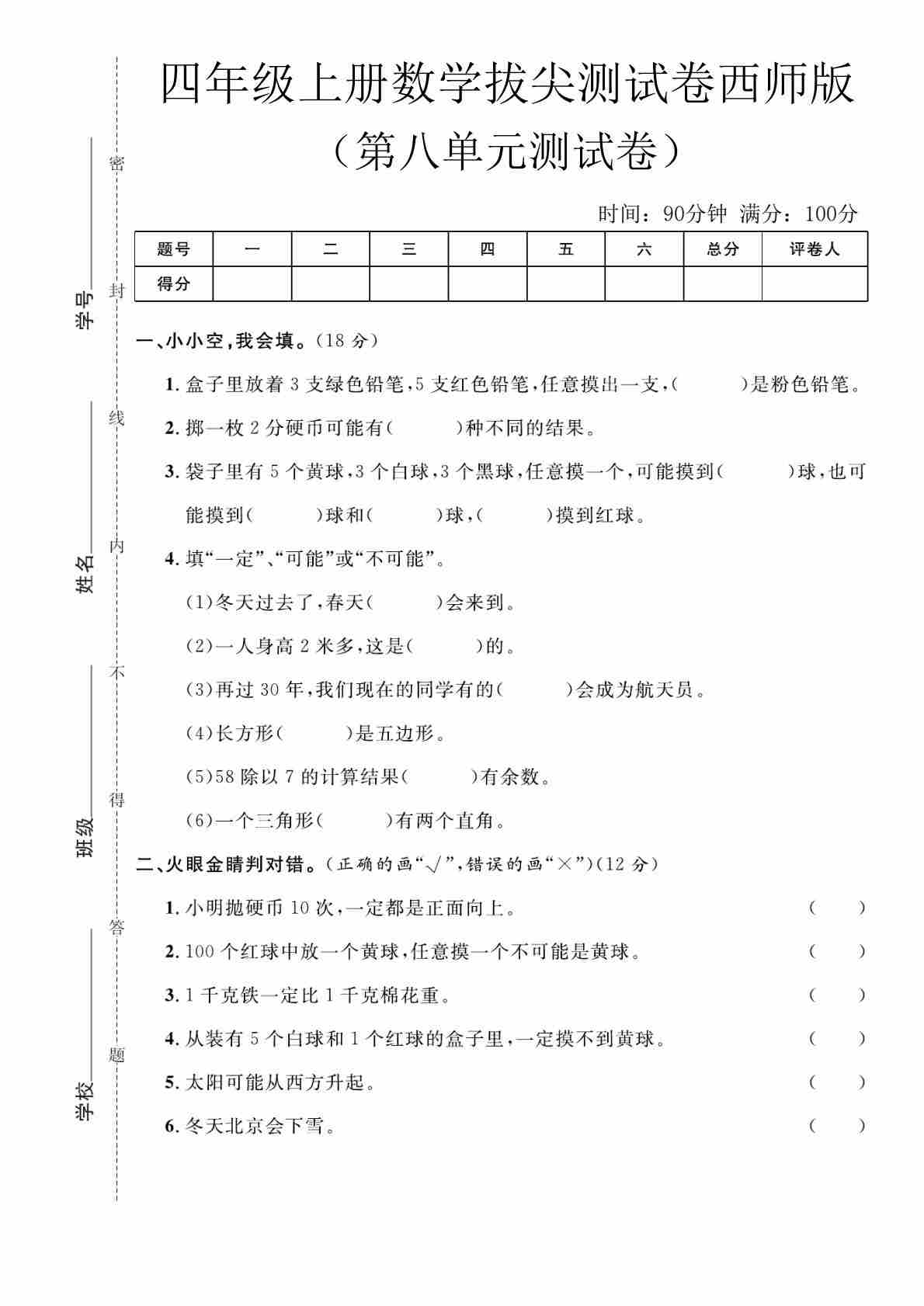 四上苏教版数学【第八单元测试卷1】