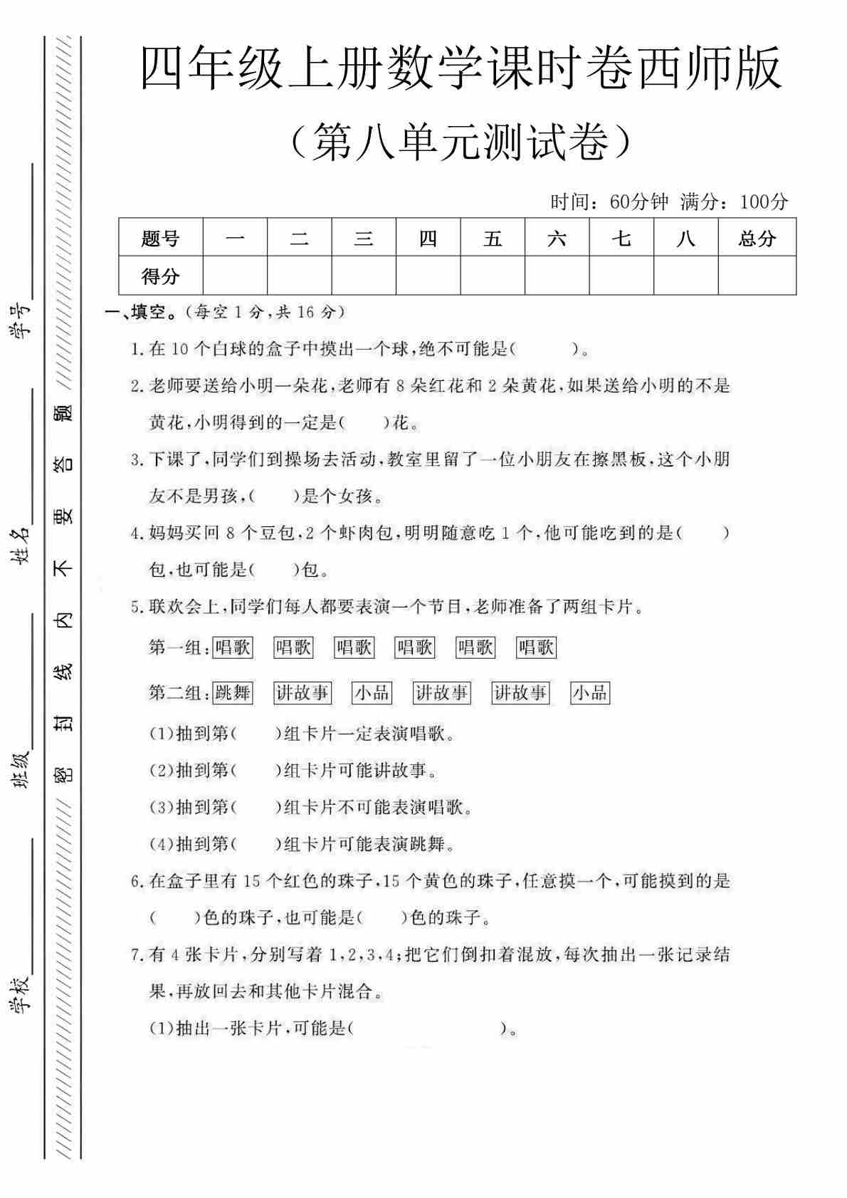 四上西师版数学【第八单元课时卷】