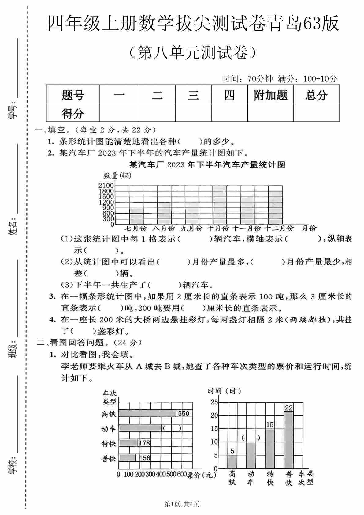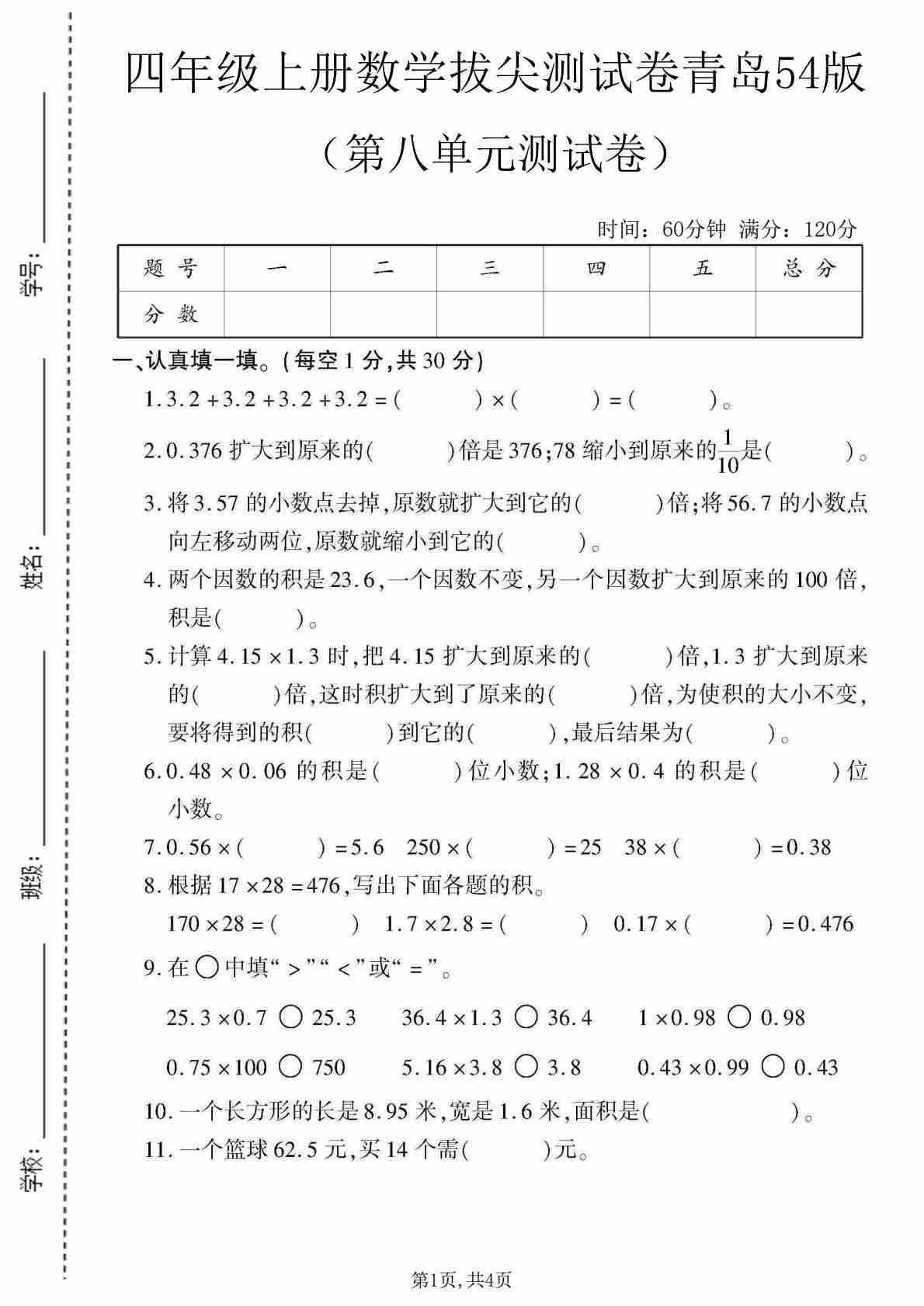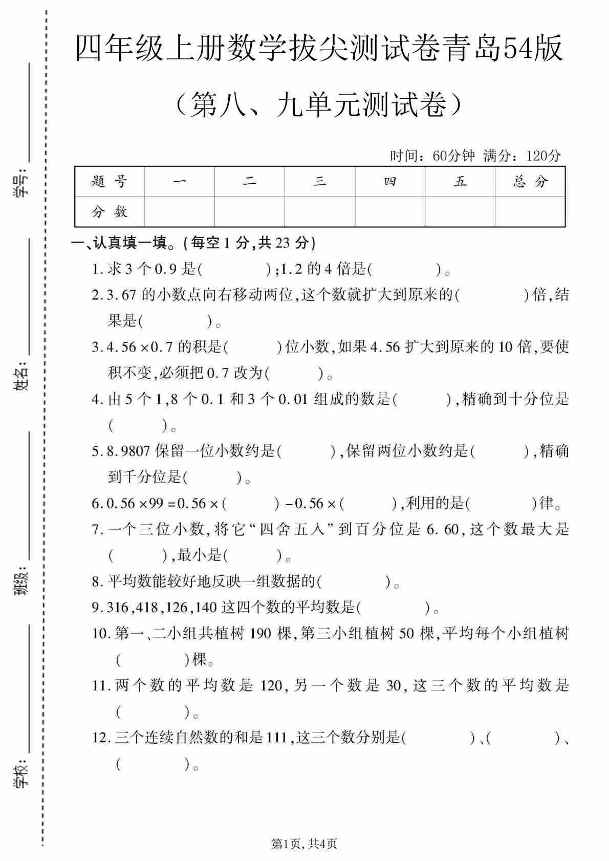 四上青岛五四制数学【第七单元测试卷】