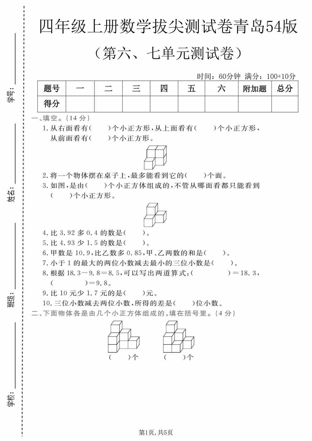 四上青岛五四制数学【第六、七单元拔尖测试卷】