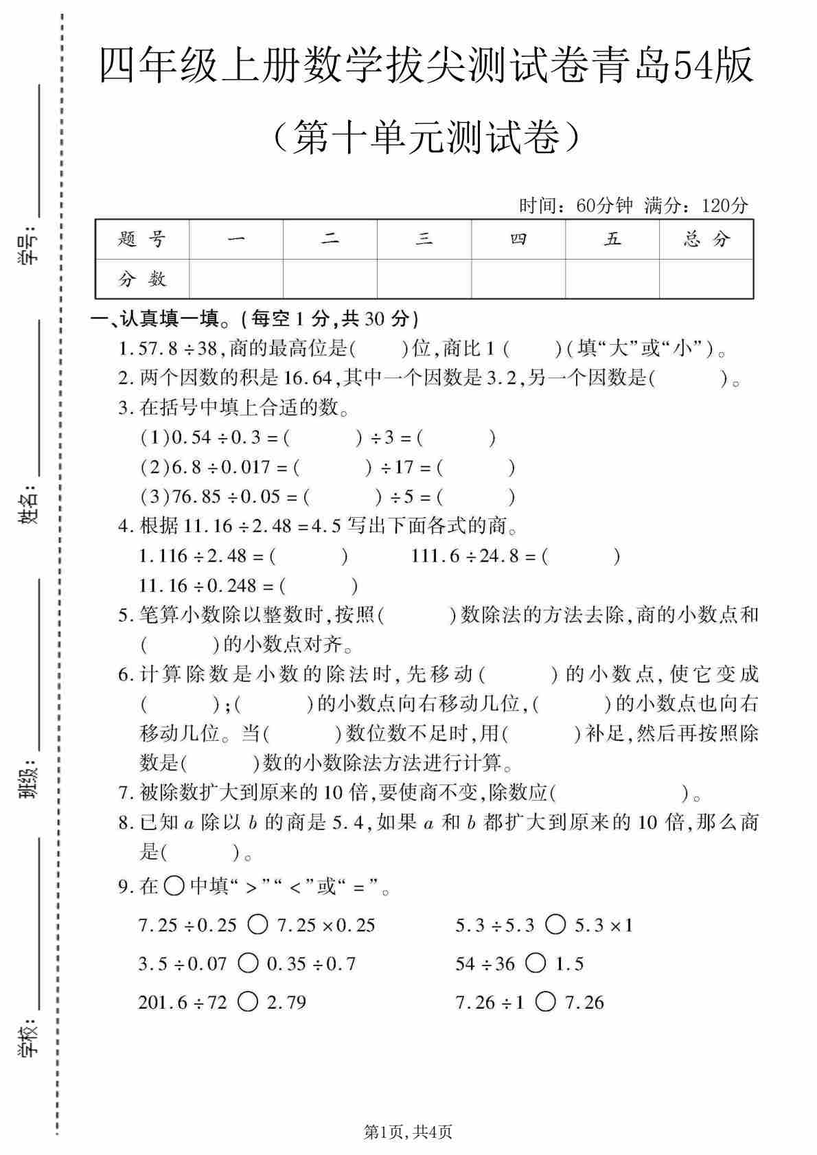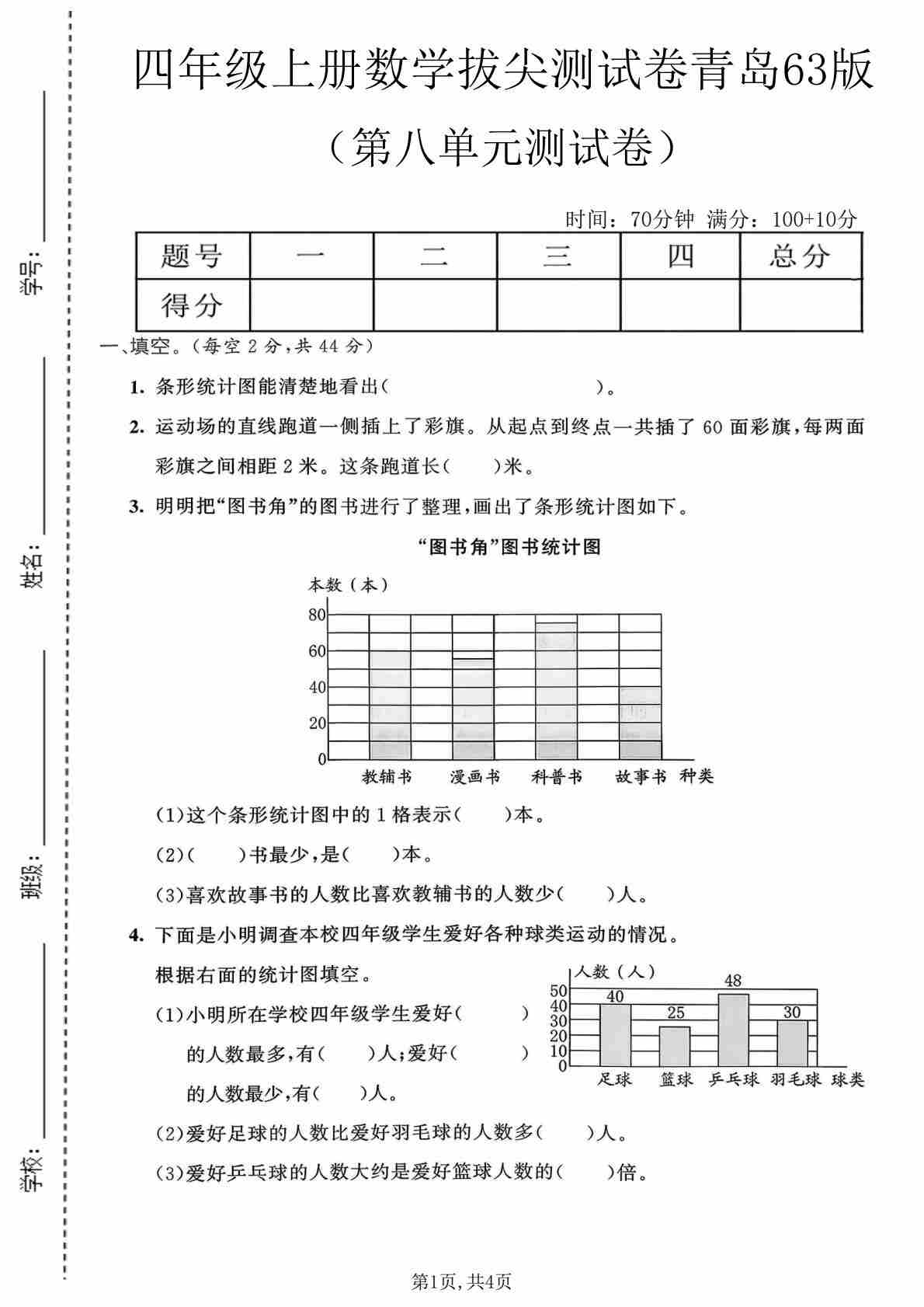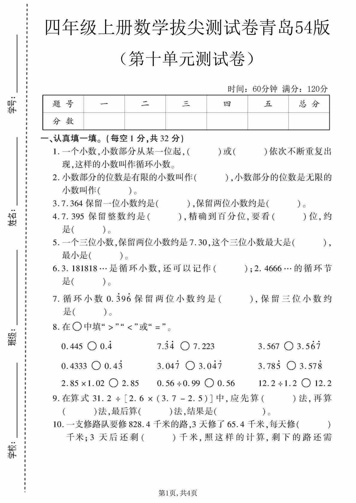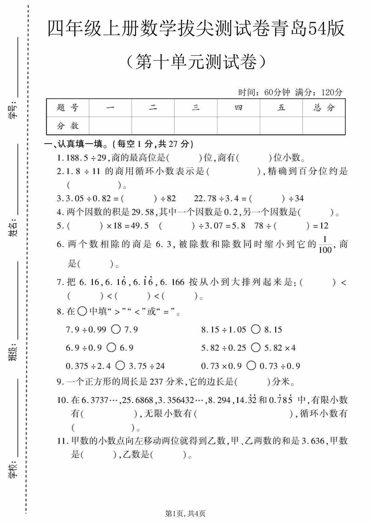 四上青岛五四制数学【第十单元测试卷1】