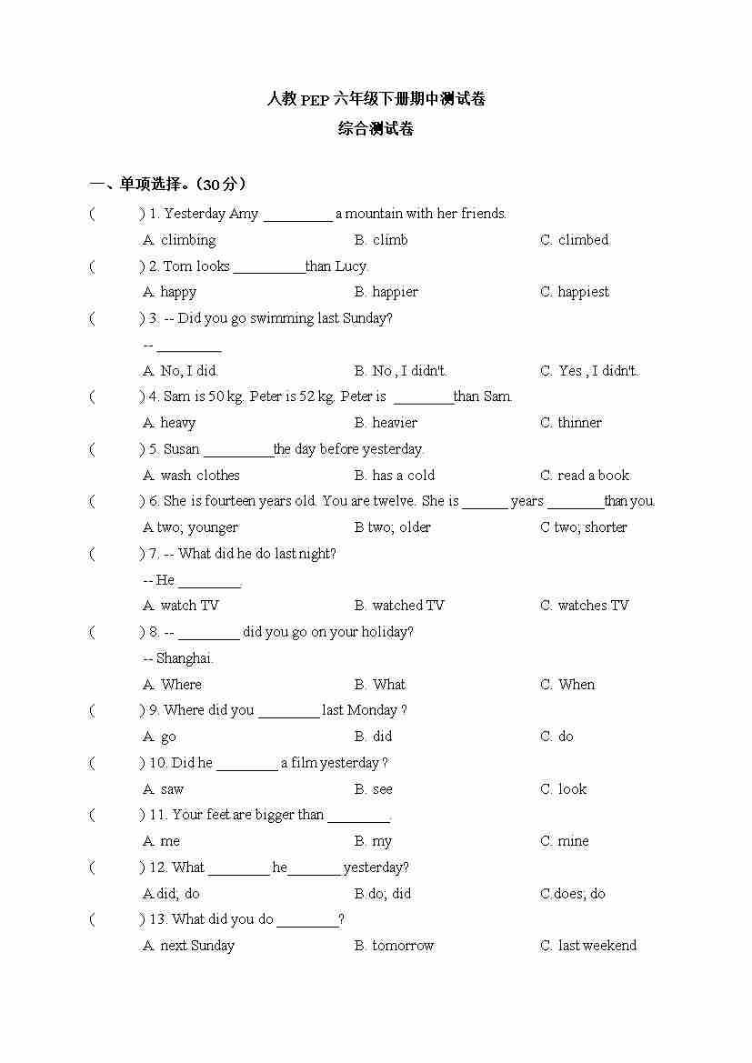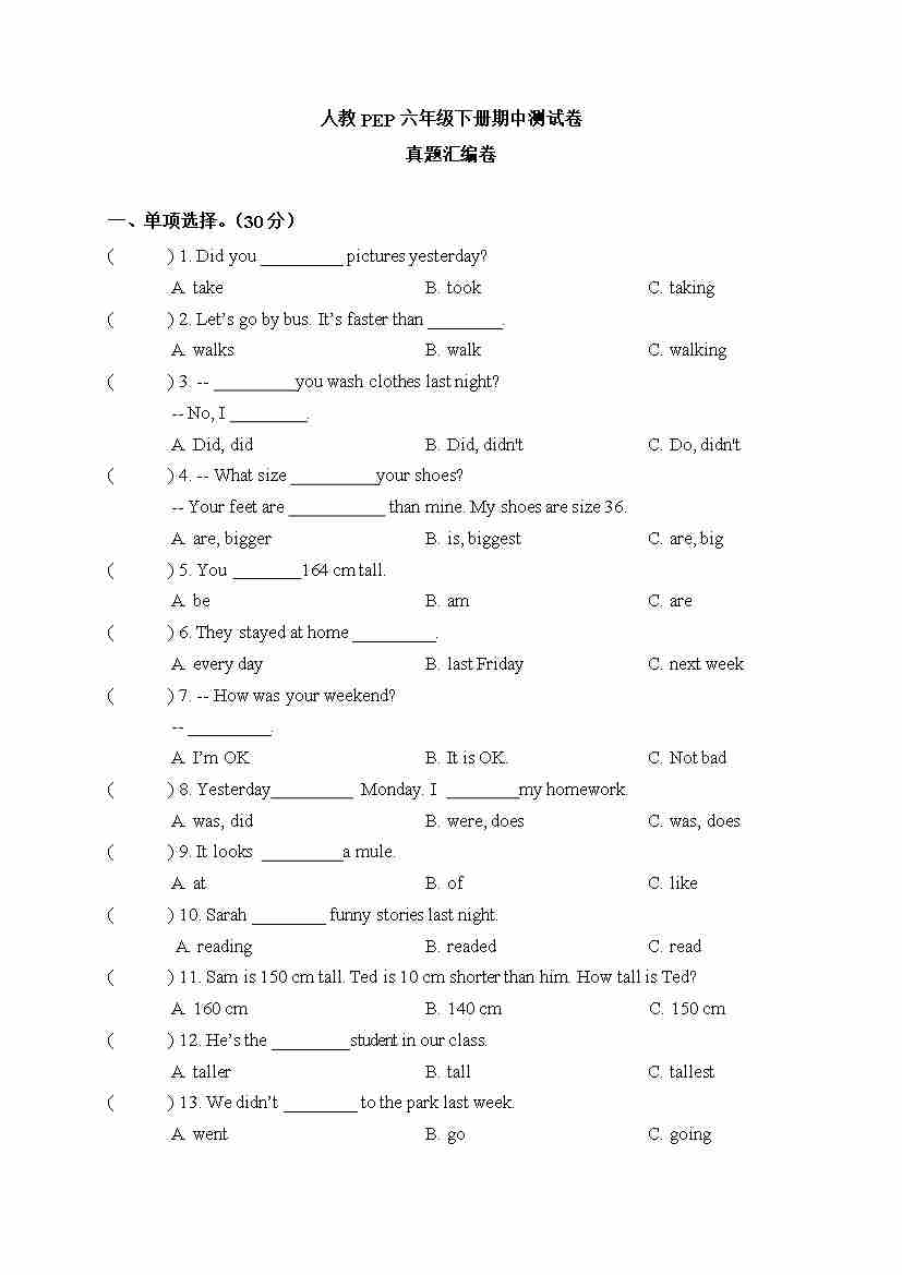 【期中真题汇编卷】 人教PEP六年级下册英语期中测试卷55