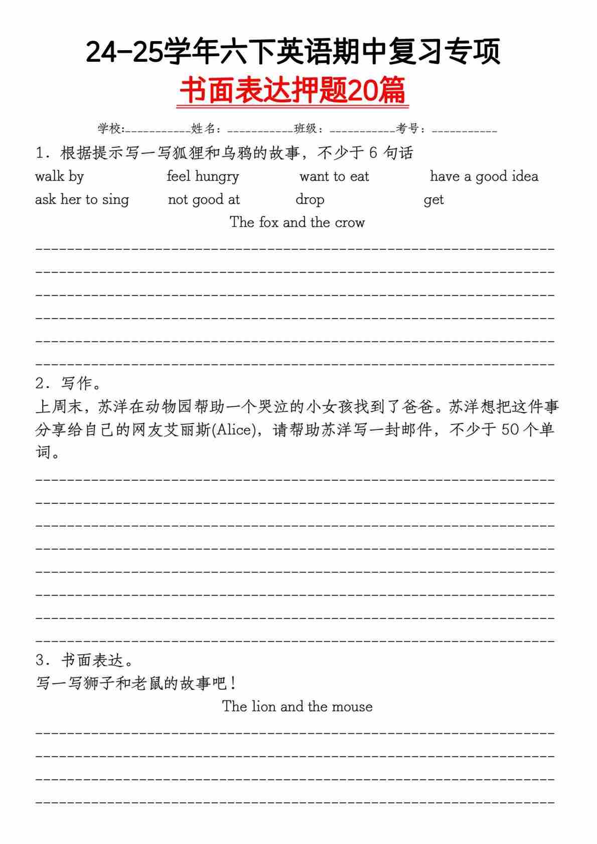 六下英语【期中押题作文20篇】