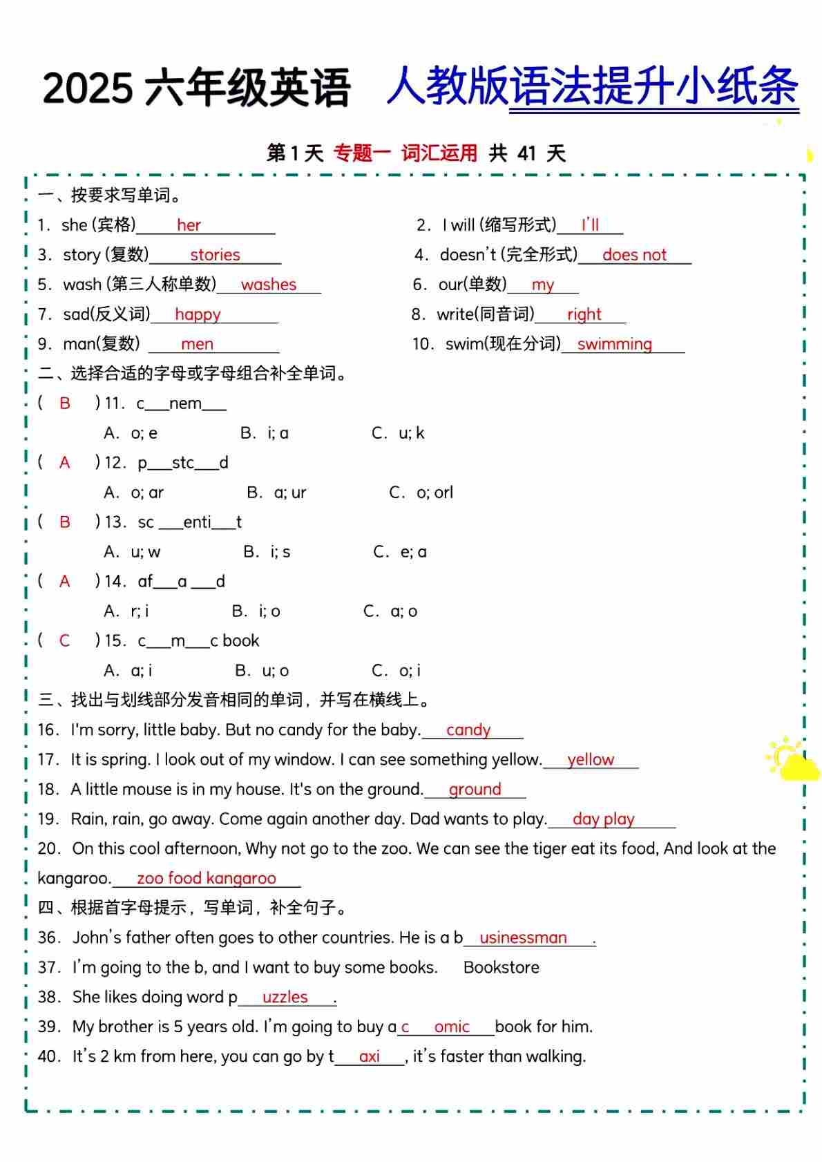 六年级人教寒假语法小纸条【答案】.