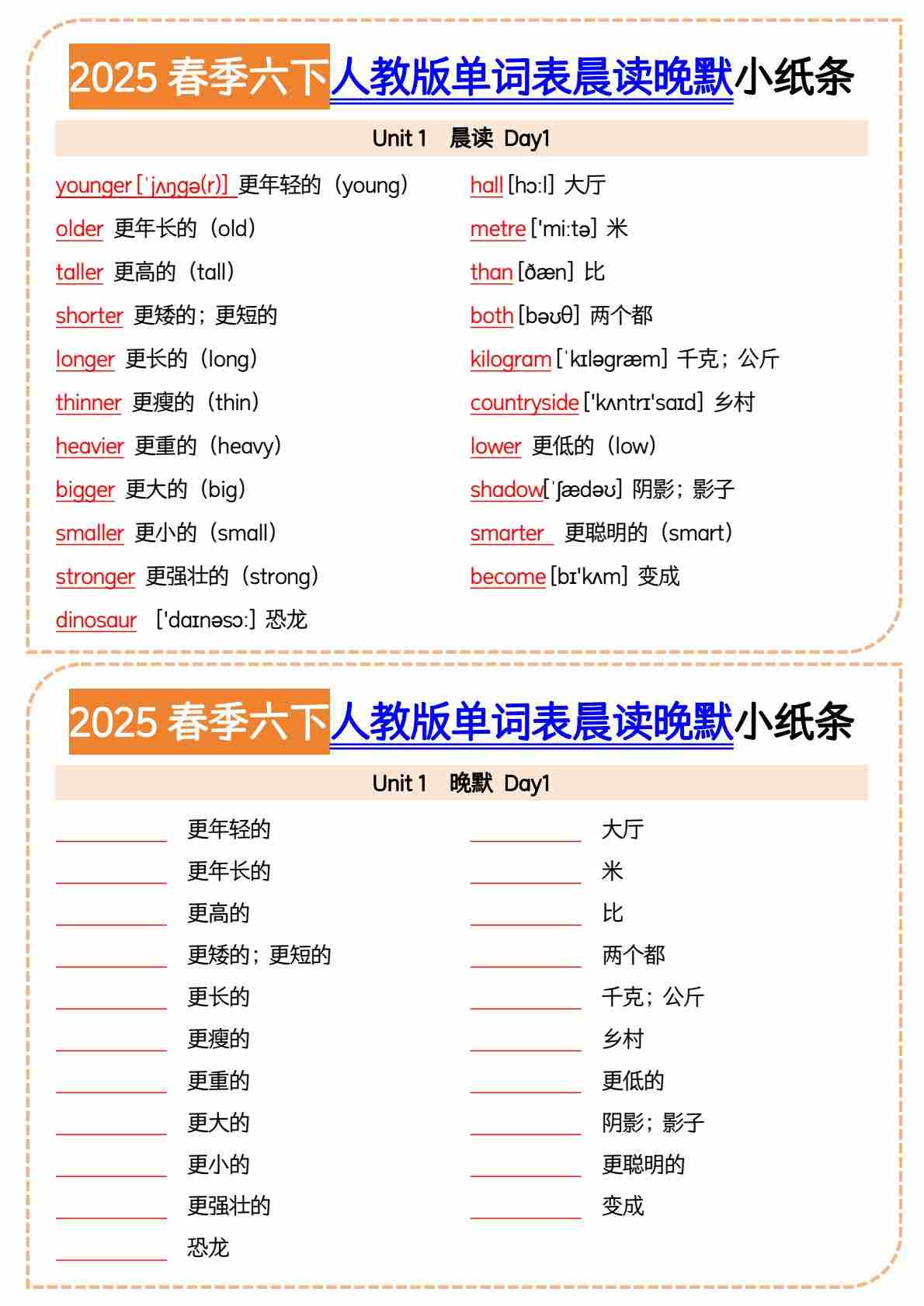 六(下)英语人教PEP版单词表晨读晚默小纸条