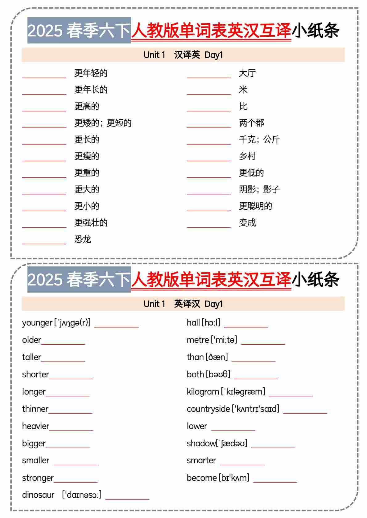 六(下)英语人教PEP版单词表英汉互译小纸条