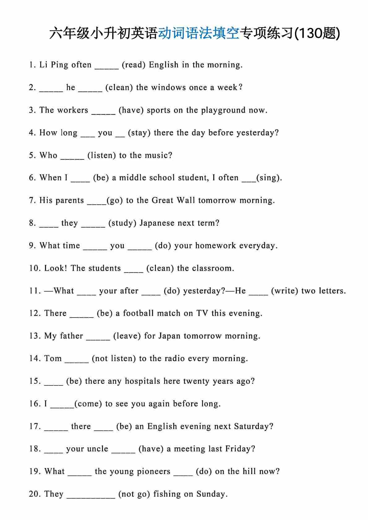 六(下)英语人教版PEP动词语法填空专项拔尖练习(130题)