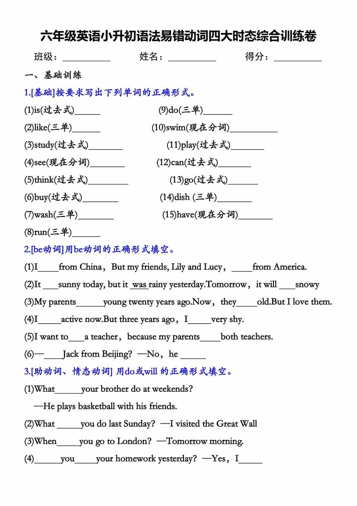 六(下)英语小升初语法易错动词四大时态综合训练卷