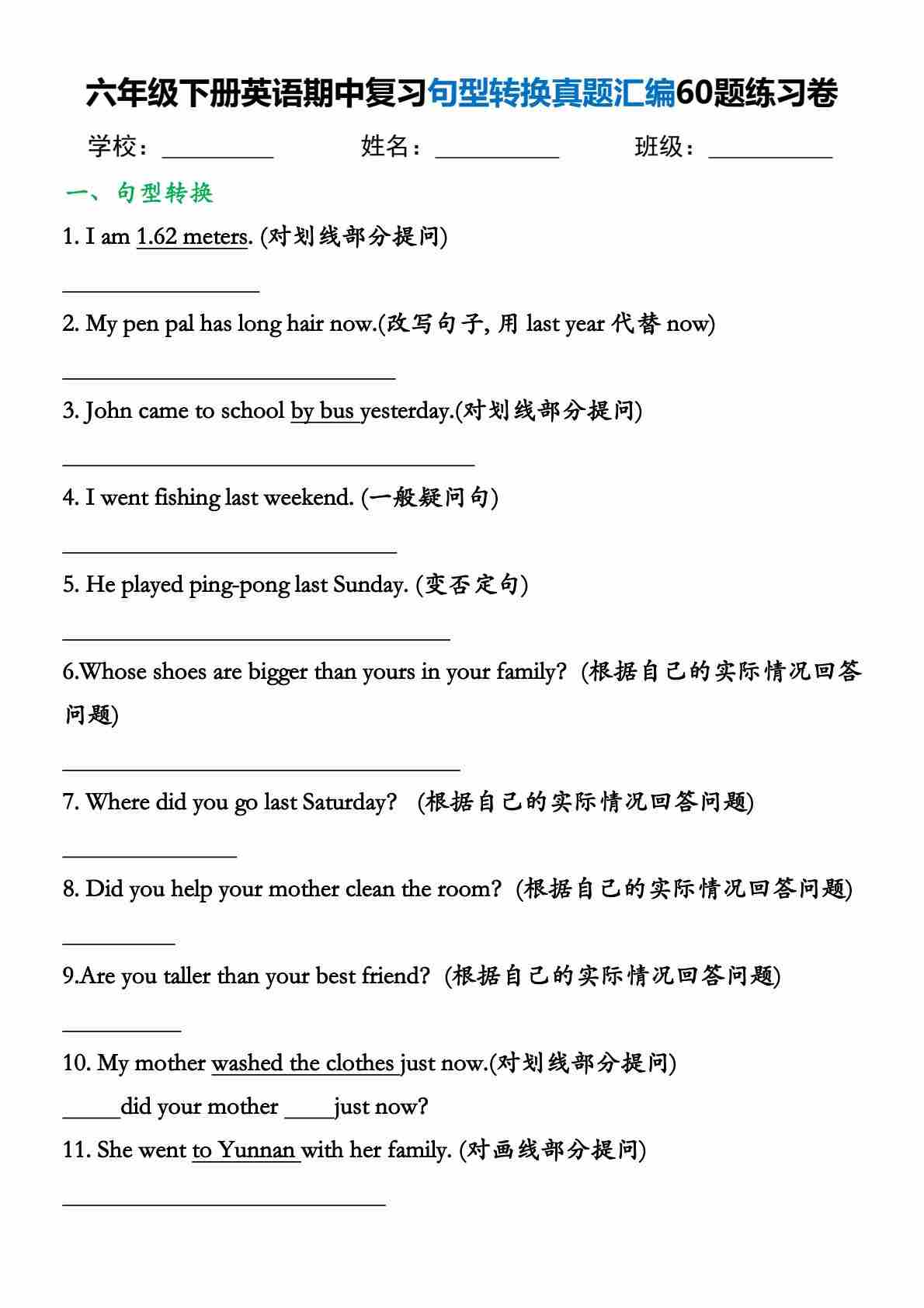 六(下)英语期中复习句型转换真题汇编60题练习卷
