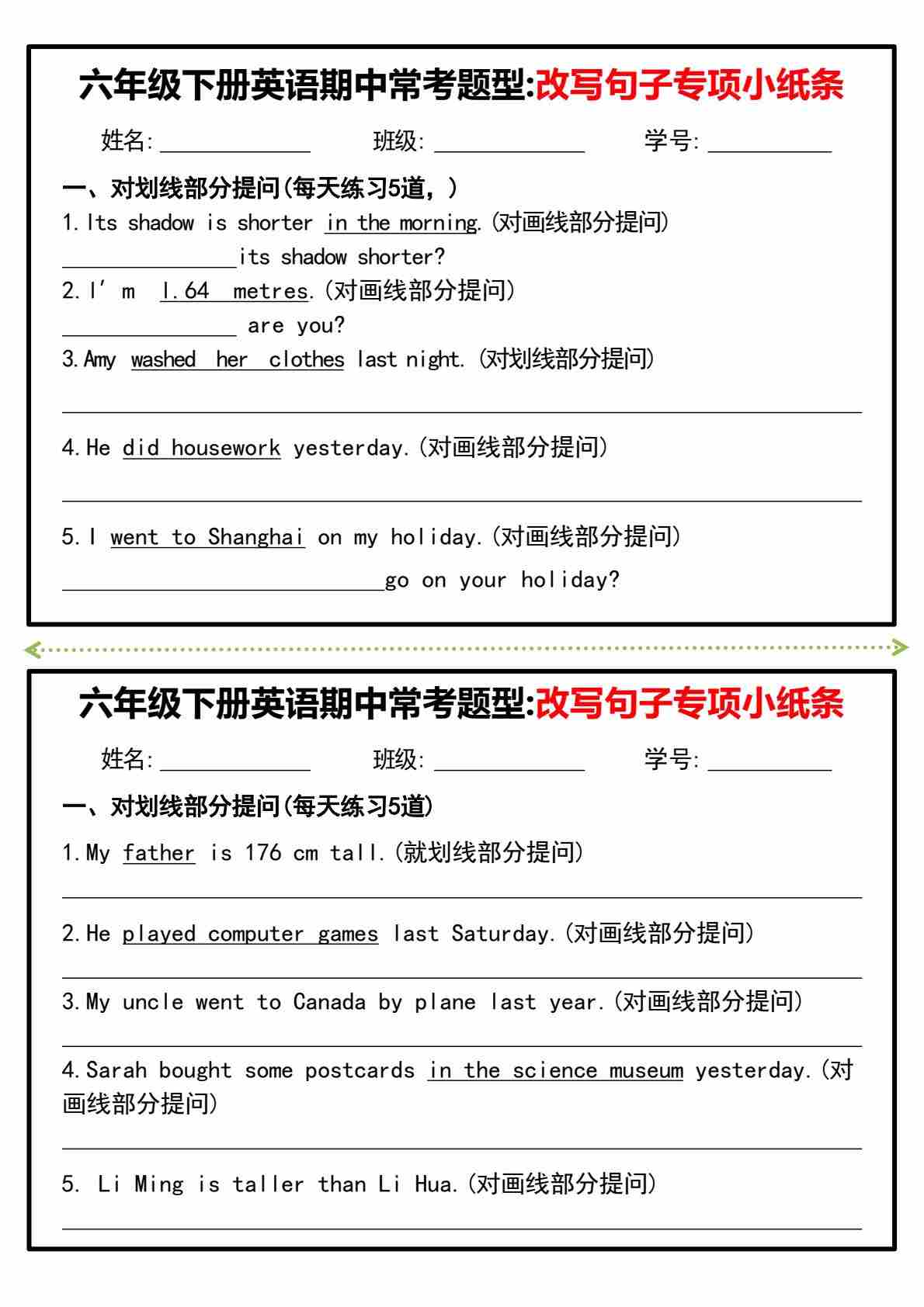 六(下)英语期中常考题型改写句子专项小纸条