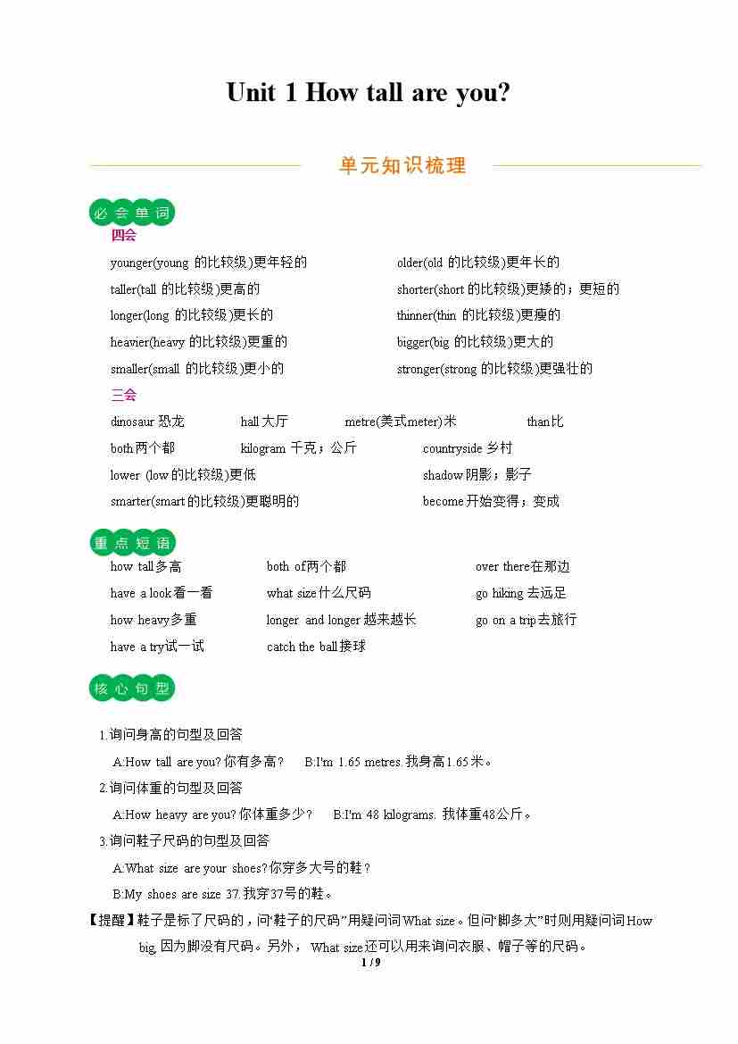Unit 1 How tall are you ? 重难点讲练(含答案)