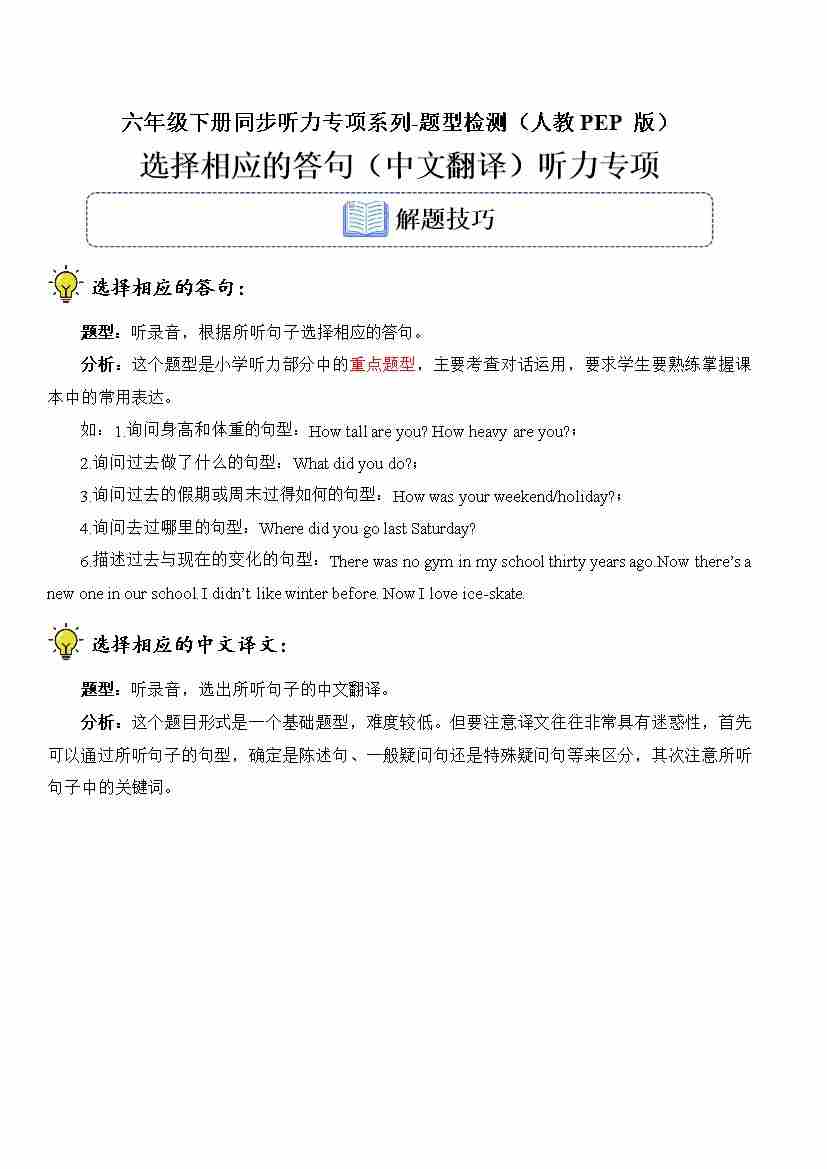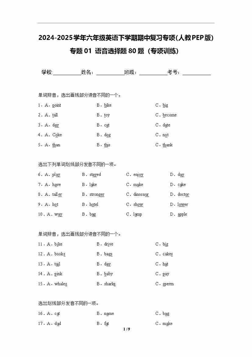 专题01 语音选择题80题(专项训练)-2024-2025学年六年级英语下学期期中复习专项(人教PEP版)(含答案解析)