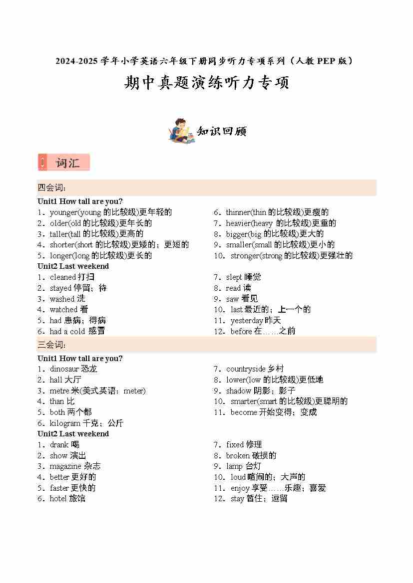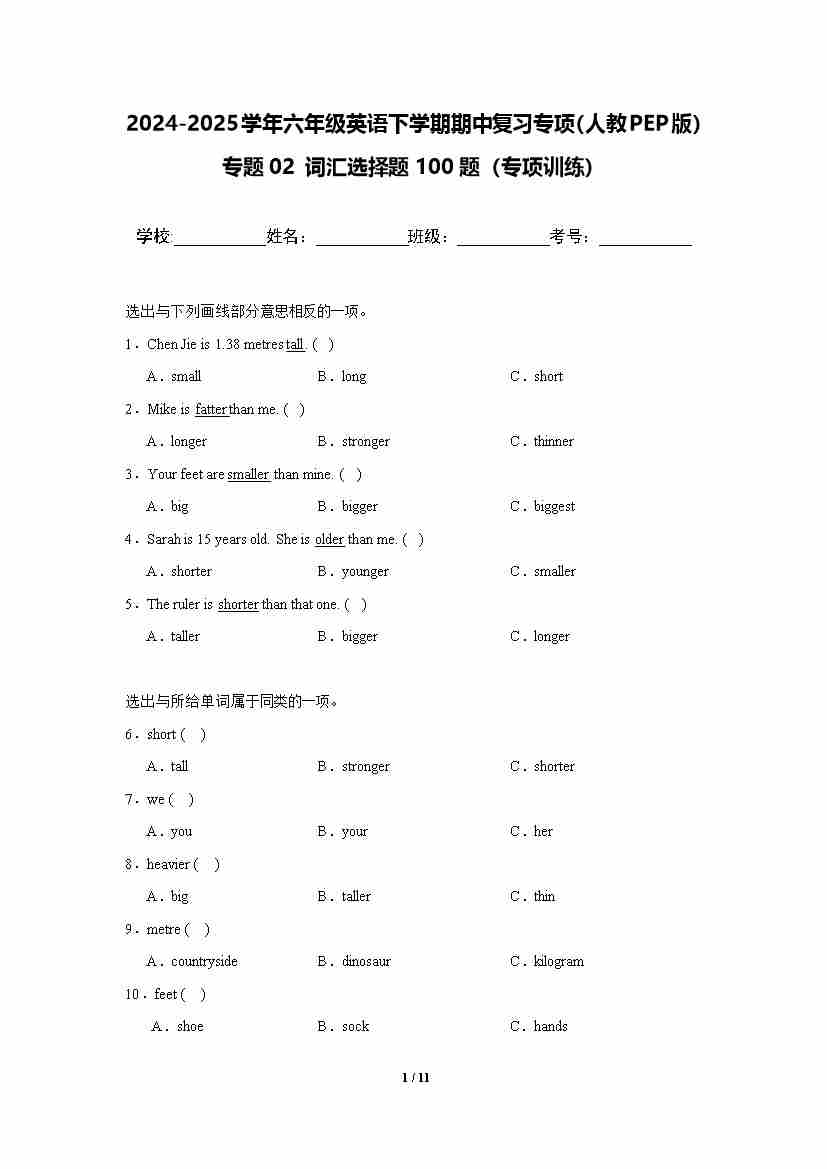 专题02 词汇选择题100题(专项训练)-2024-2025学年六年级英语下学期期中复习专项(人教PEP版)(含答案解析)