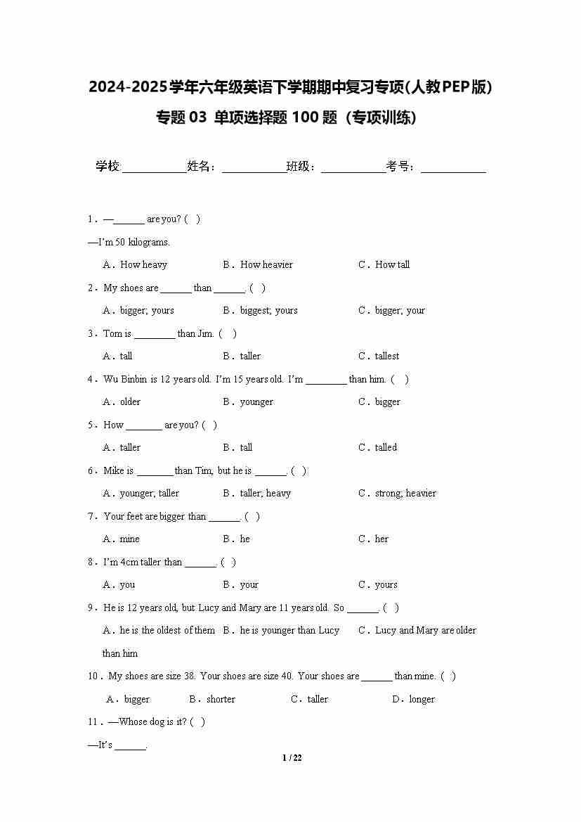 专题03 单项选择题100题(专项训练)-2024-2025学年六年级英语下学期期中复习专项(人教PEP版)(含答案解析)