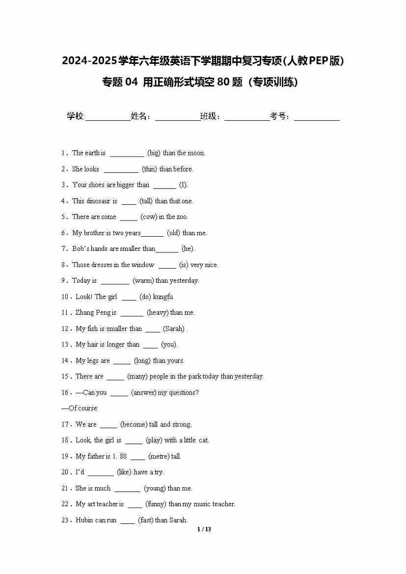专题04 用正确形式填空80题(专项训练)-2024-2025学年六年级英语下学期期中复习专项(人教PEP版)(含答案解析)