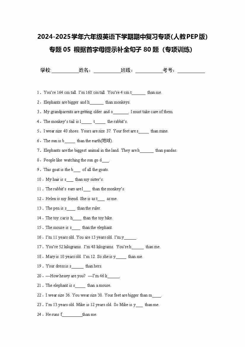 专题05 根据首字母提示补全句子80题(专项训练)-2024-2025学年六年级英语下学期期中复习专项(人教PEP版)(含答案解析)