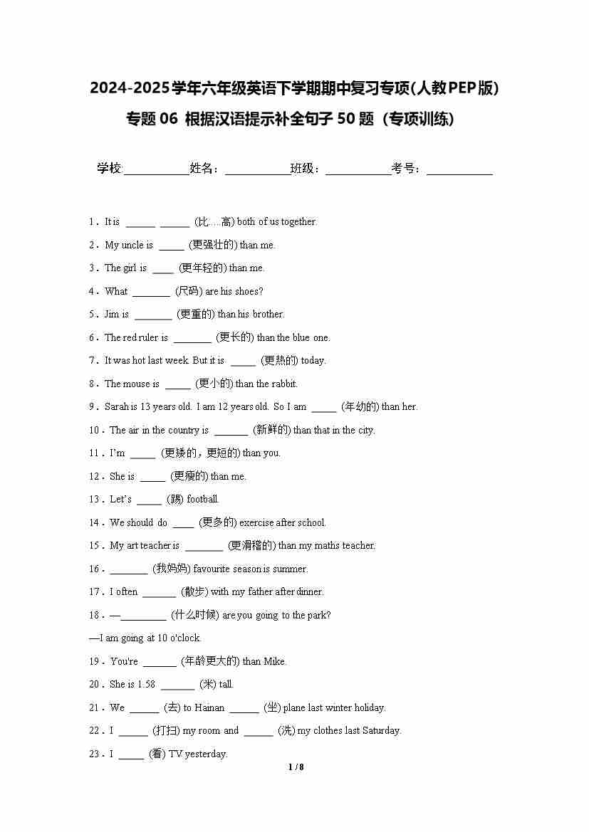 专题06 根据汉语提示补全句子50题(专项训练)-2024-2025学年六年级英语下学期期中复习专项(人教PEP版)(含答案解析)