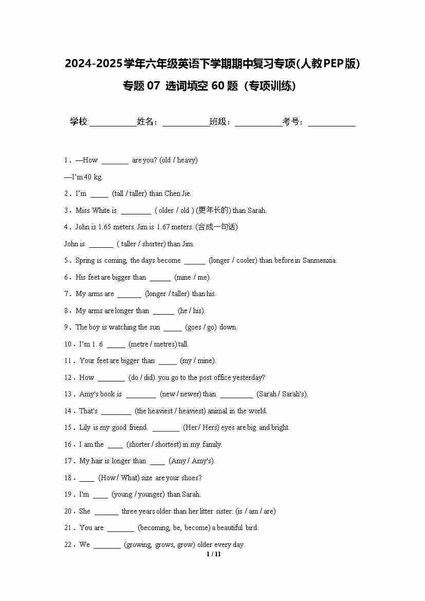 专题07 选词填空60题(专项训练)-2024-2025学年六年级英语下学期期中复习专项(人教PEP版)(含解析)
