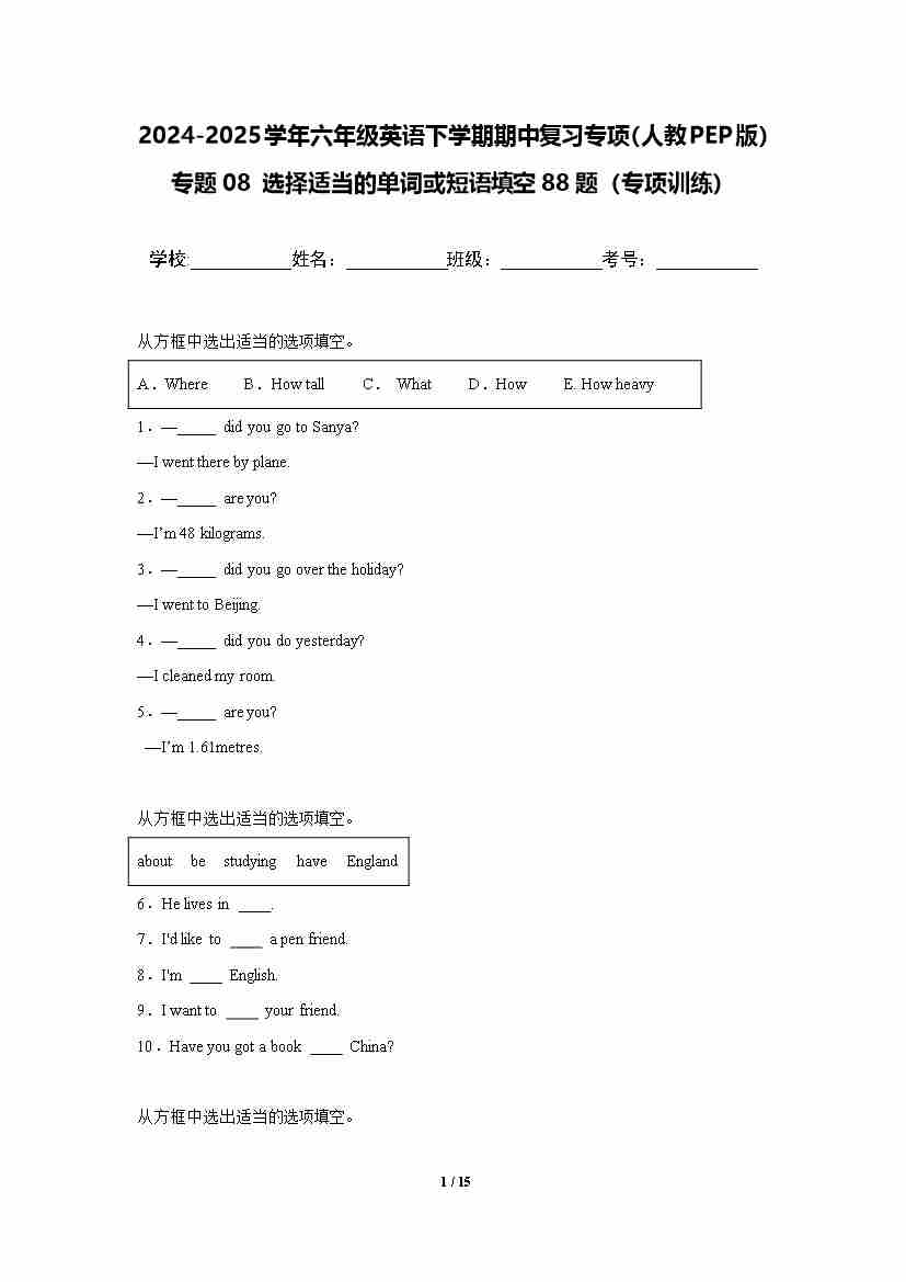 专题08 选择适当的单词或短语填空88题(专项训练)-2024-2025学年六年级英语下学期期中复习专项(人教PEP版)(含答案解析)