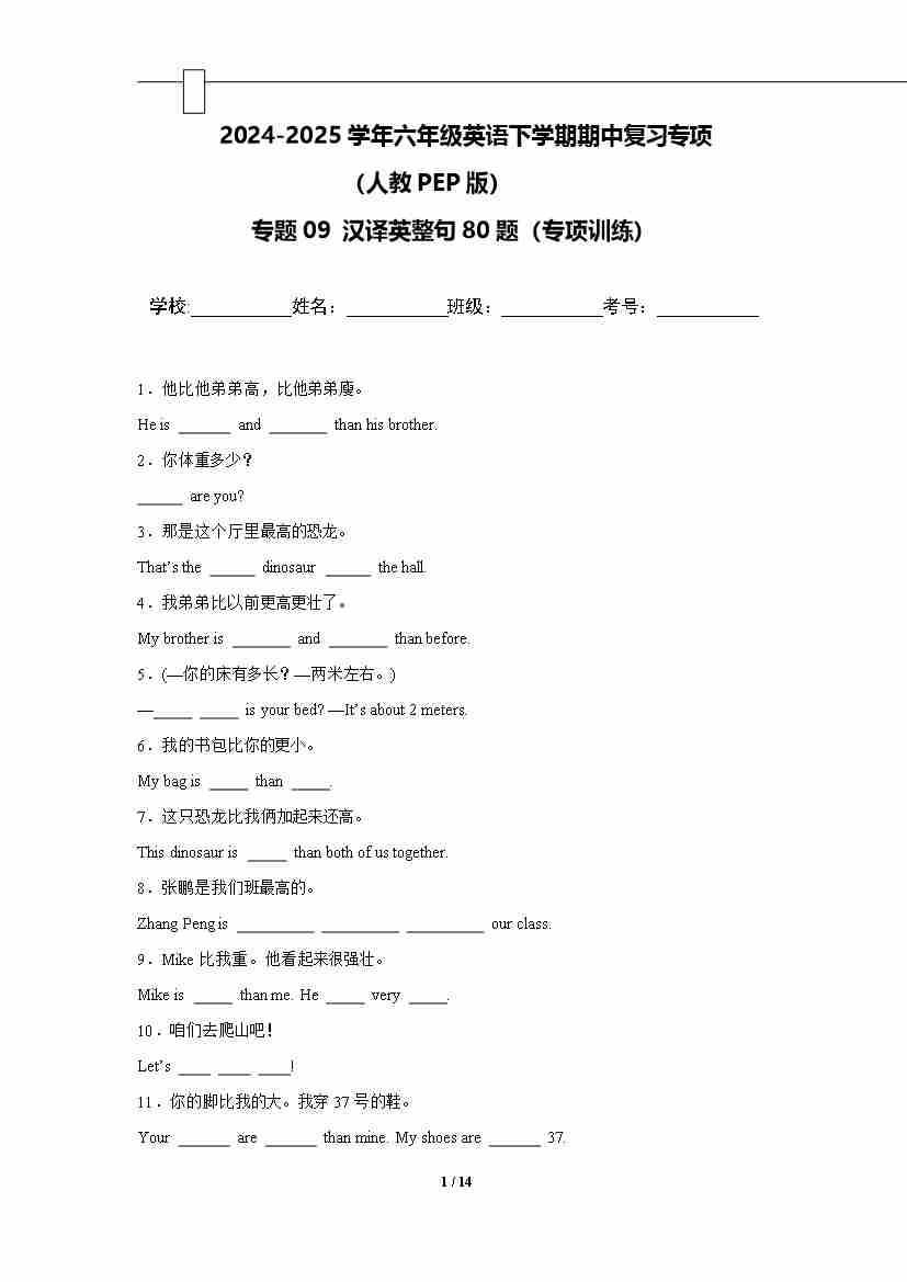 专题09 汉译英整句80题(专项训练)-2024-2025学年六年级英语下学期期中复习专项(人教PEP版)(含解析)