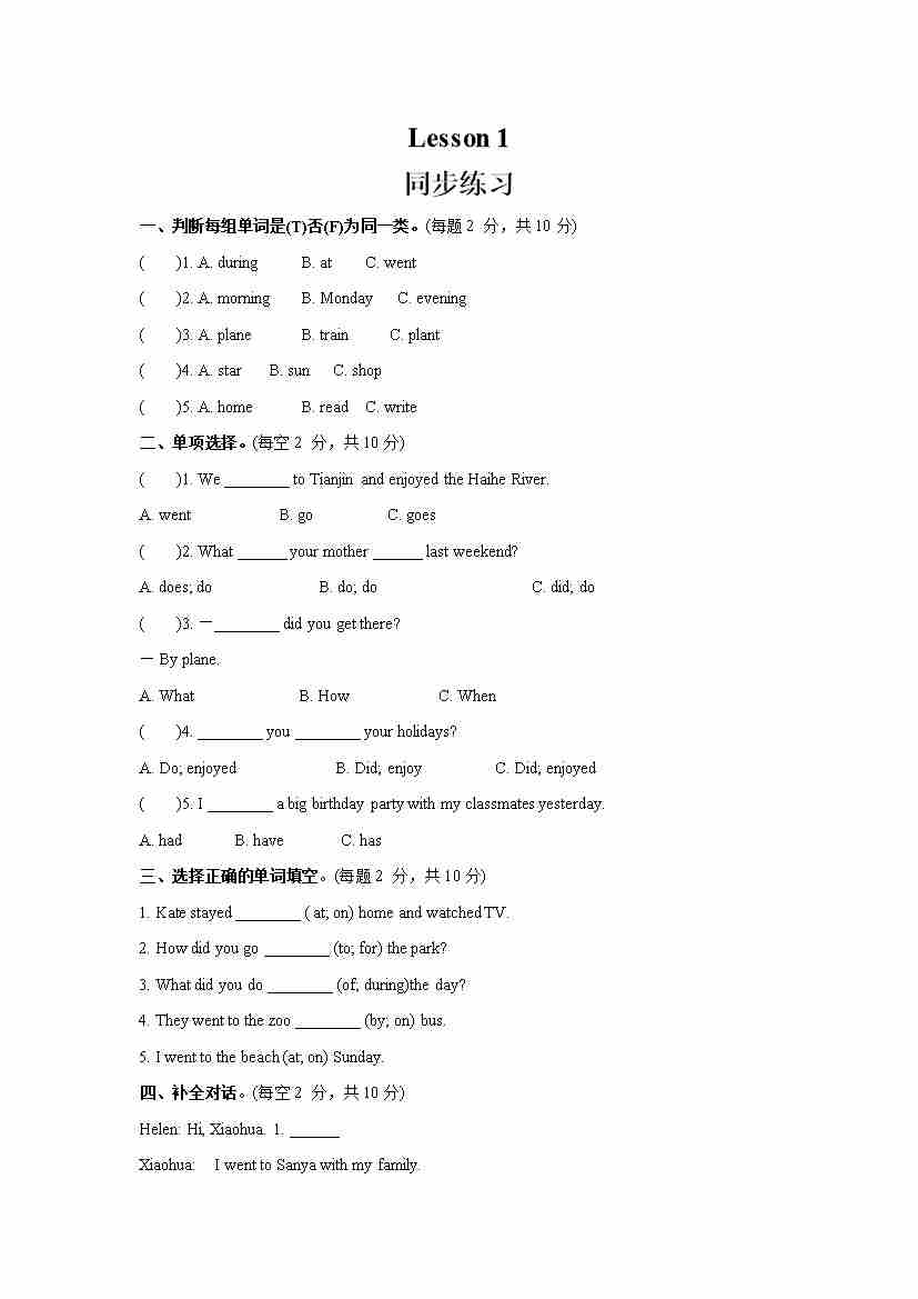 Unit 1 I went to Sanya for my holidays Lesson 1 (同步练习) 人教精通版英语六年级下册