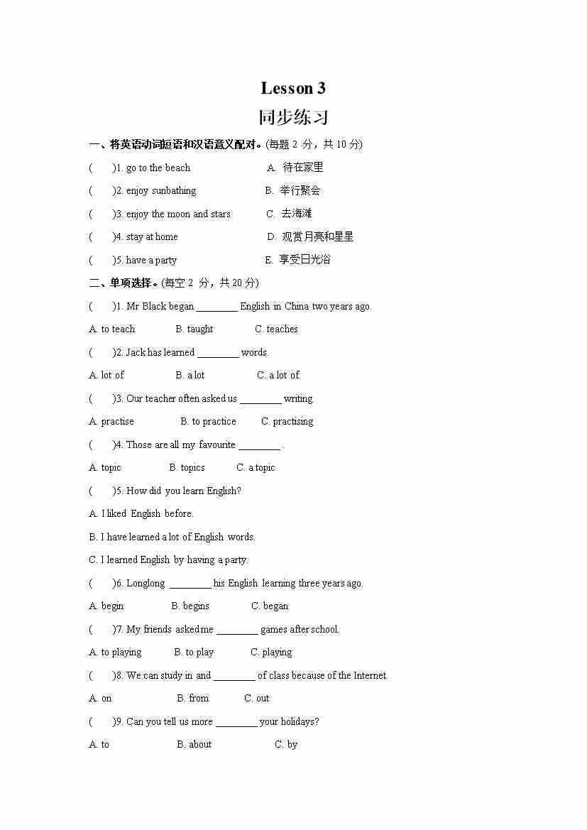 Unit 1 I went to Sanya for my holidays Lesson 3 (同步练习) 人教精通版英语六年级下册