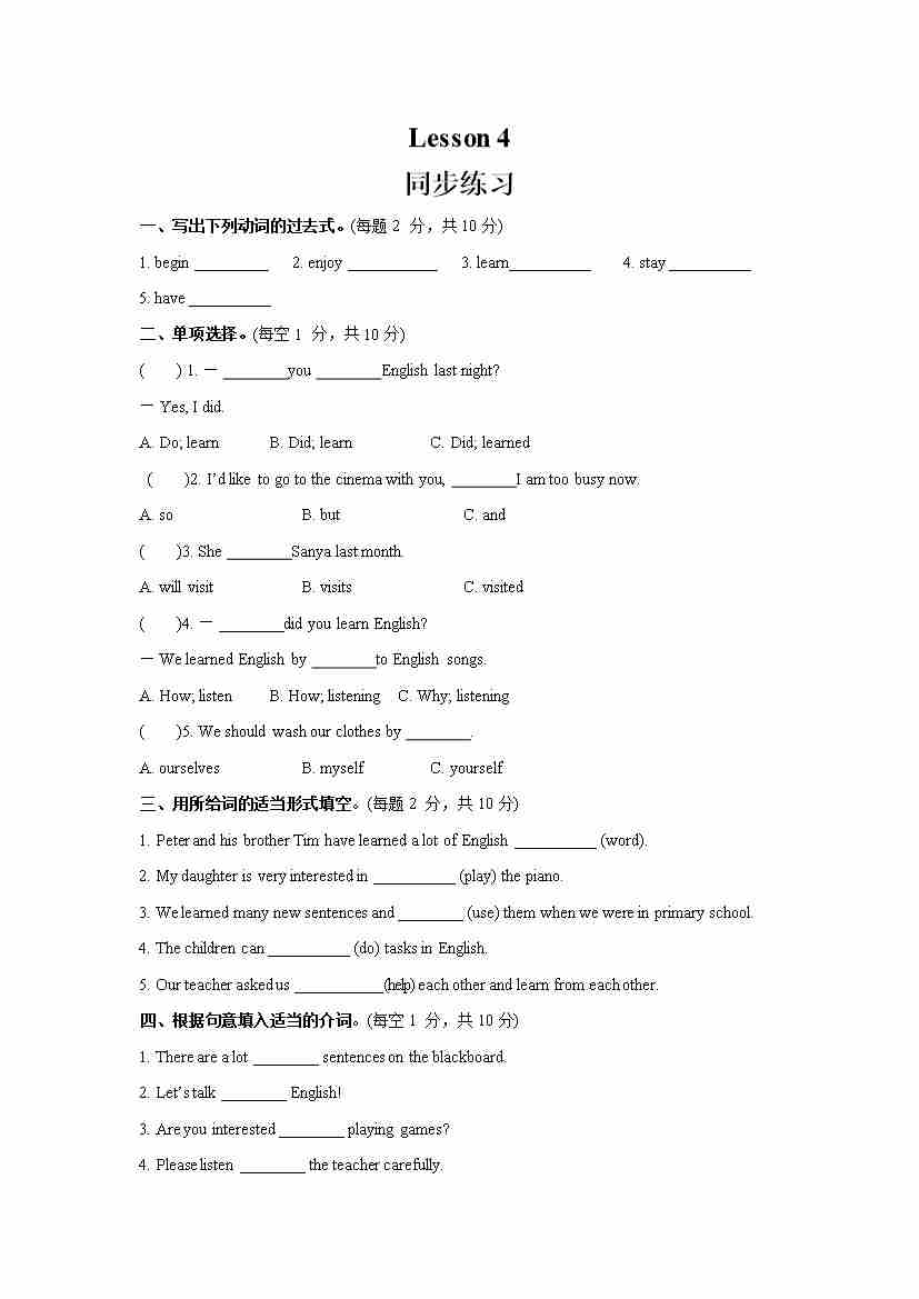 Unit 1 I went to Sanya for my holidays Lesson 4 (同步练习) 人教精通版英语六年级下册