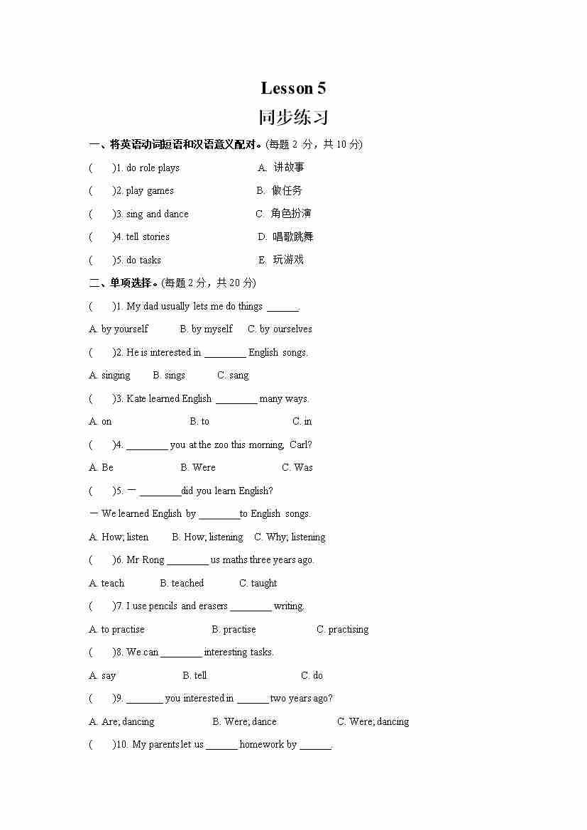 Unit 1 I went to Sanya for my holidays Lesson 5 (同步练习) 人教精通版英语六年级下册