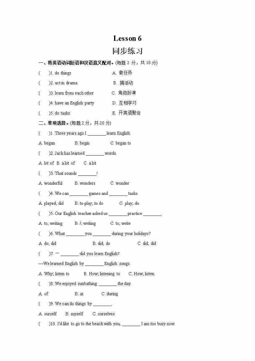 Unit 1 I went to Sanya for my holidays Lesson 6 (同步练习) 人教精通版英语六年级下册
