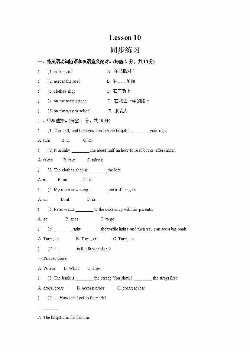 Unit 2 There is a park near my home. Lesson 10 (同步练习) 人教精通版英语六年级下册