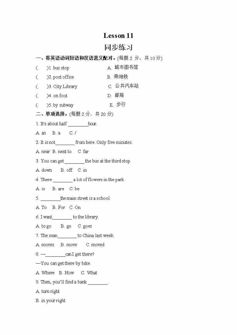 Unit 2 There is a park near my home. Lesson 11 (同步练习) 人教精通版英语六年级下册