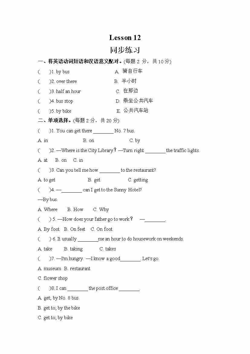 Unit 2 There is a park near my home. Lesson 12 (同步练习) 人教精通版英语六年级下册