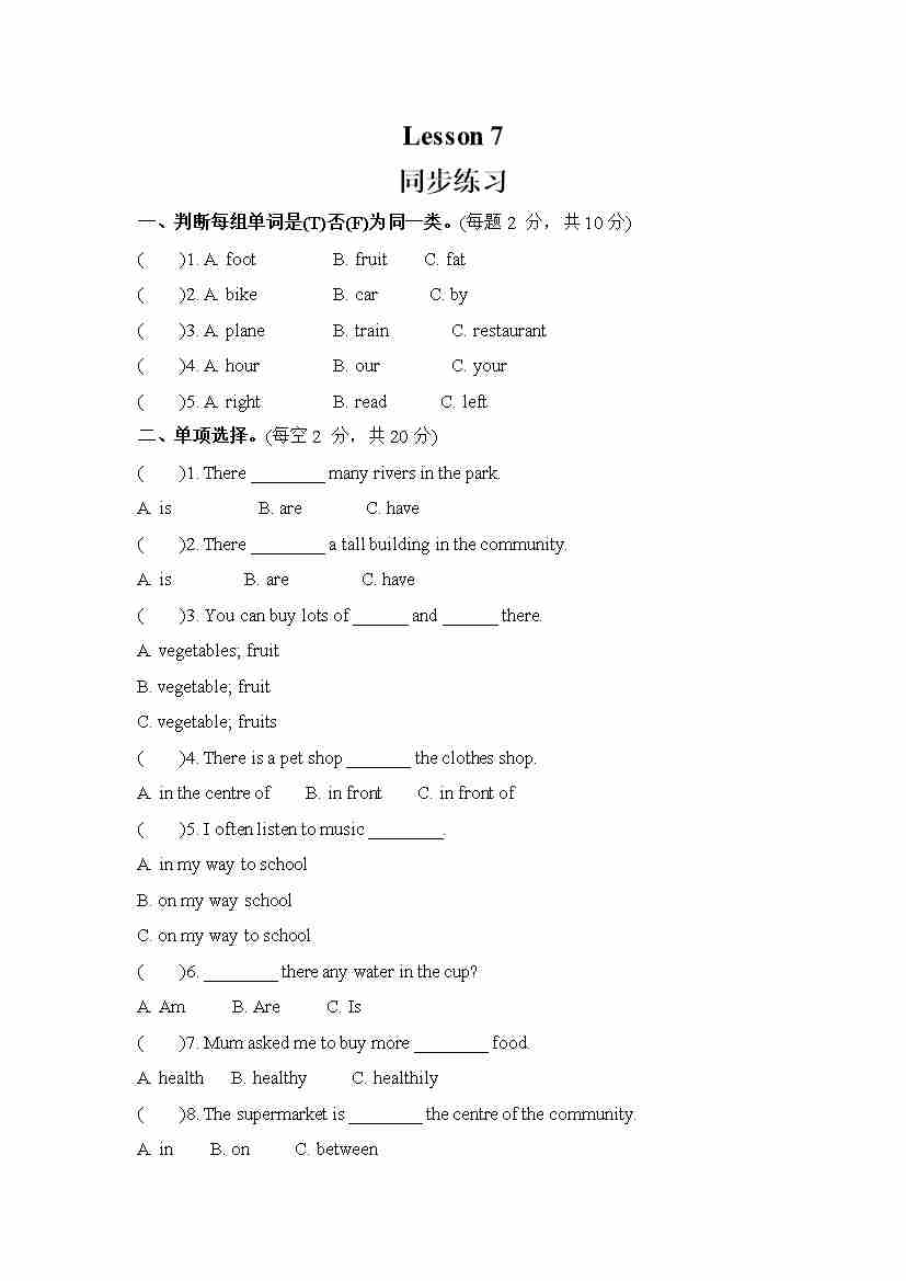 Unit 2 There is a park near my home. Lesson 7 (同步练习) 人教精通版英语六年级下册