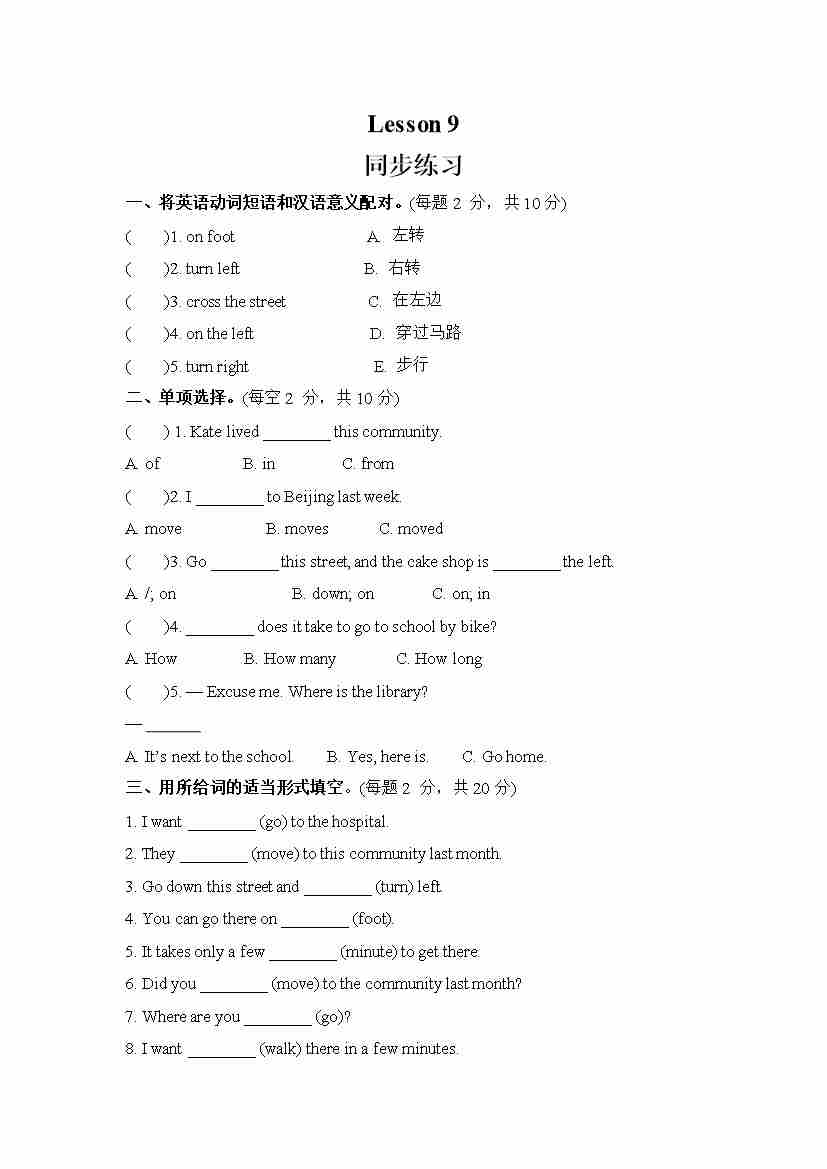 Unit 2 There is a park near my home. Lesson 9 (同步练习) 人教精通版英语六年级下册