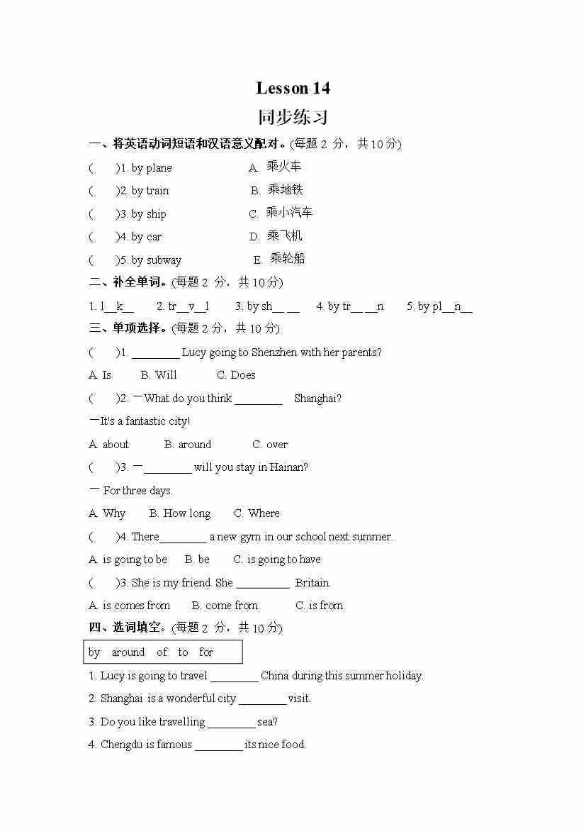 Unit 3 We are going to travel.Lesson 14 (同步练习) 人教精通版英语六年级下册