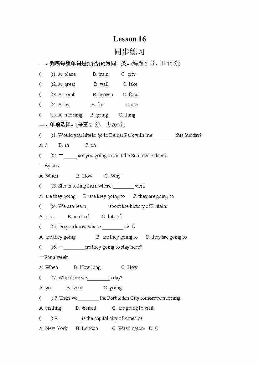 Unit 3 We are going to travel.Lesson 16 (同步练习) 人教精通版英语六年级下册